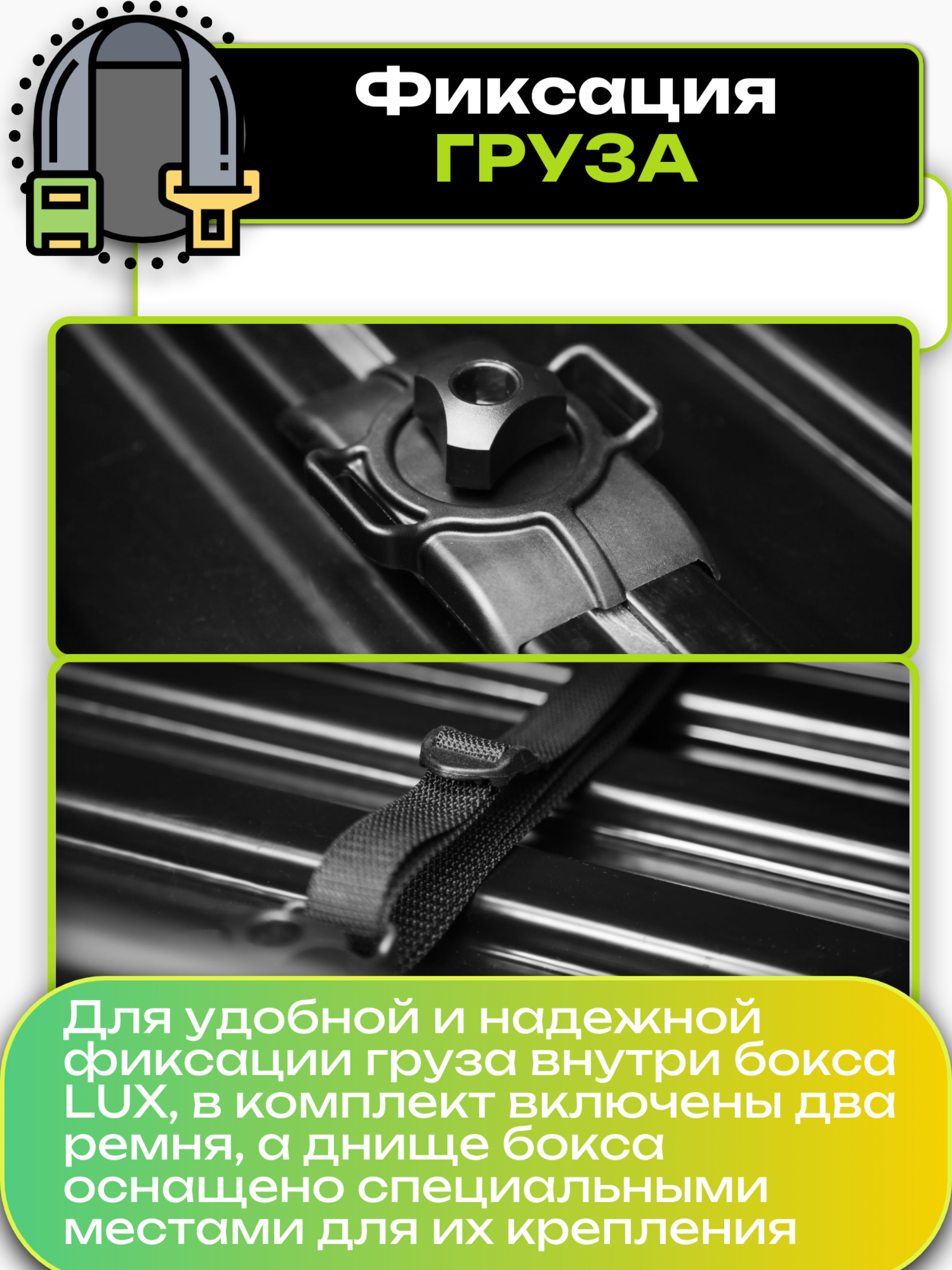 В комплект бокса входят два ремня, а днище бокса оборудовано специальными местами крепления ремней.