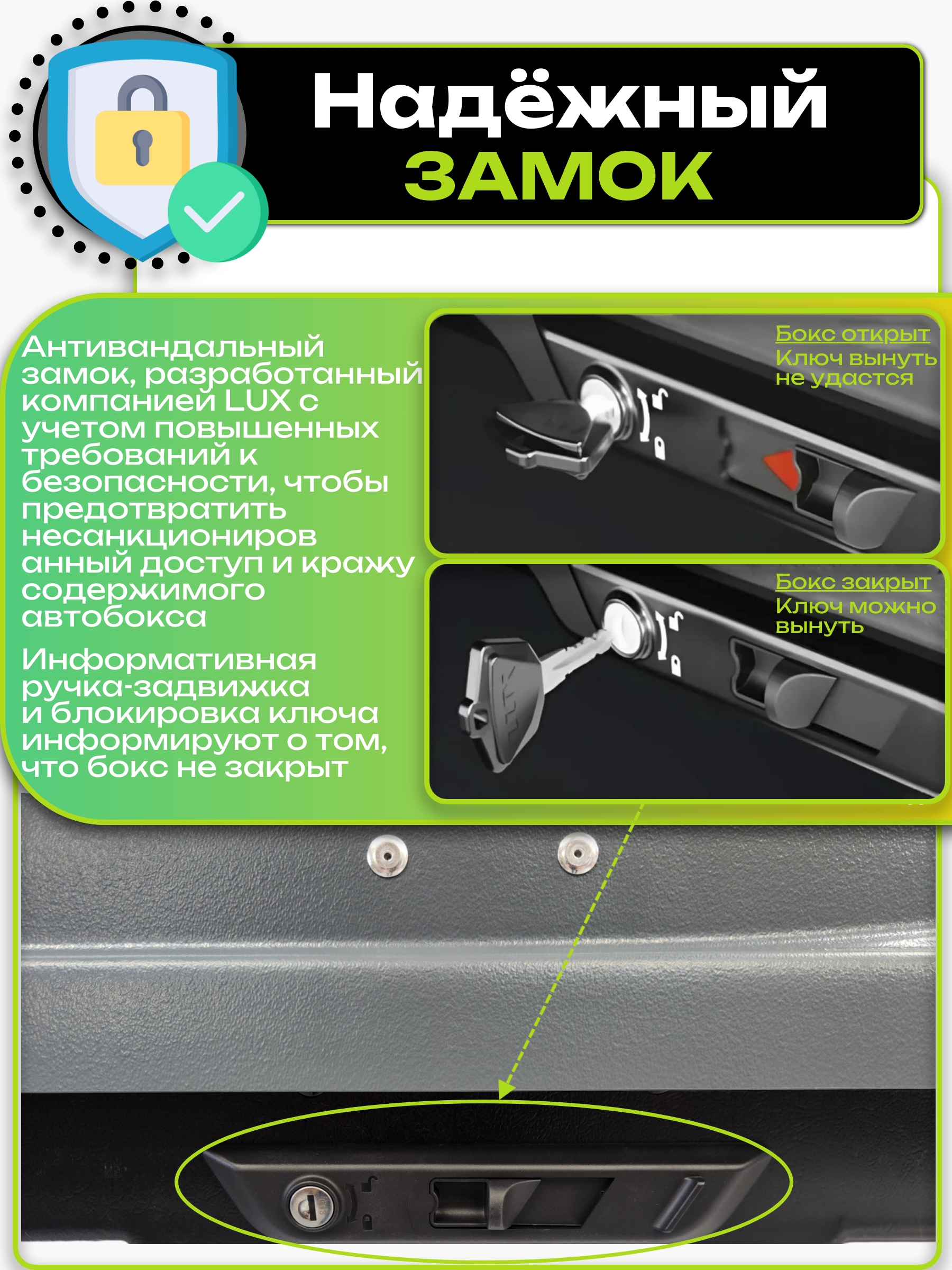 Информативный замок-задвижка с индикатором дает точное понимание о закрытии бокса.