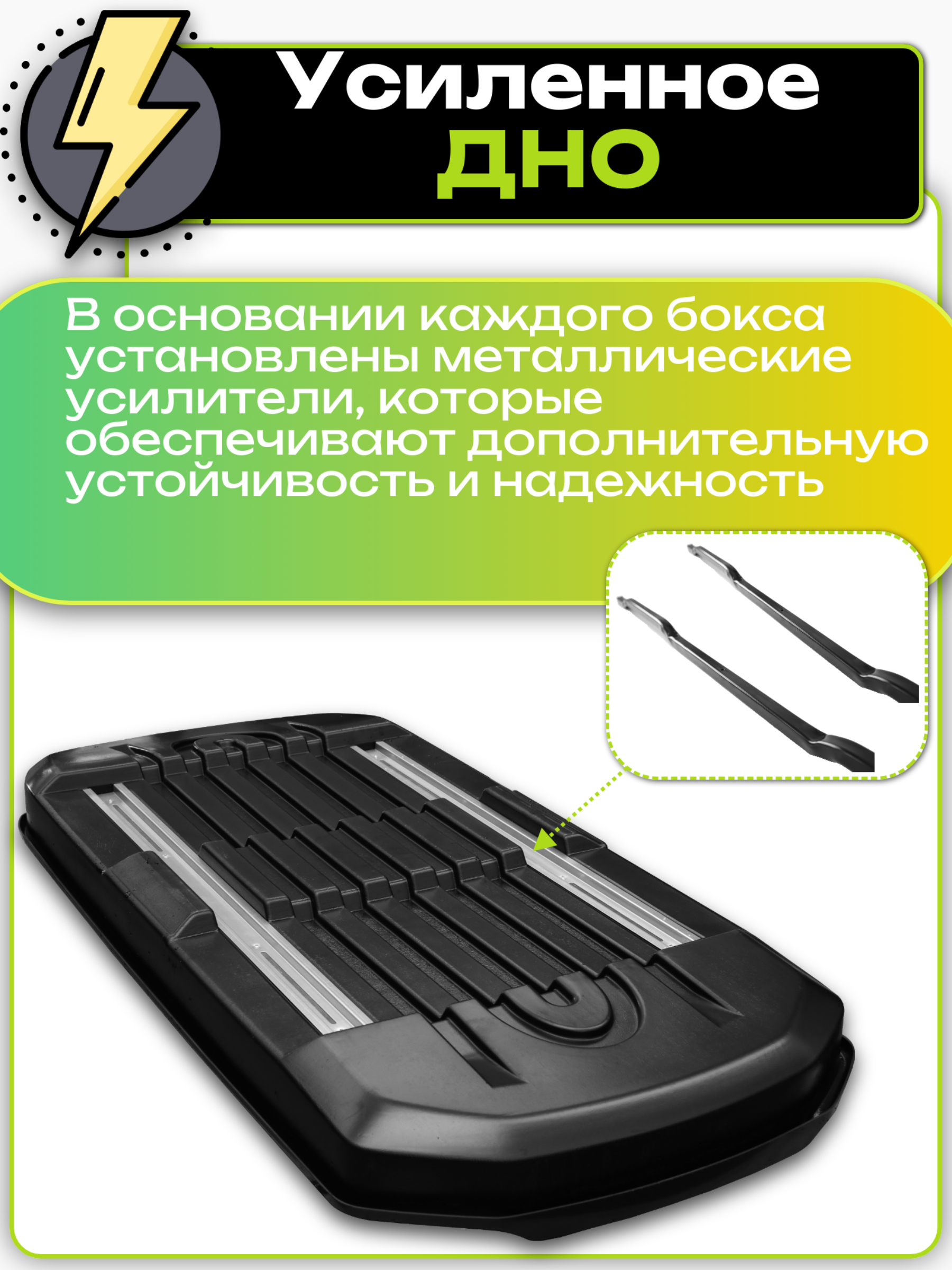 Днище бокса LUX IRBIS усиленно металлическими жесткостями, что позволяет равномерно распределять нагрузку по днищу бокса и способствует увеличению грузоподъёмности и прочности бокса.