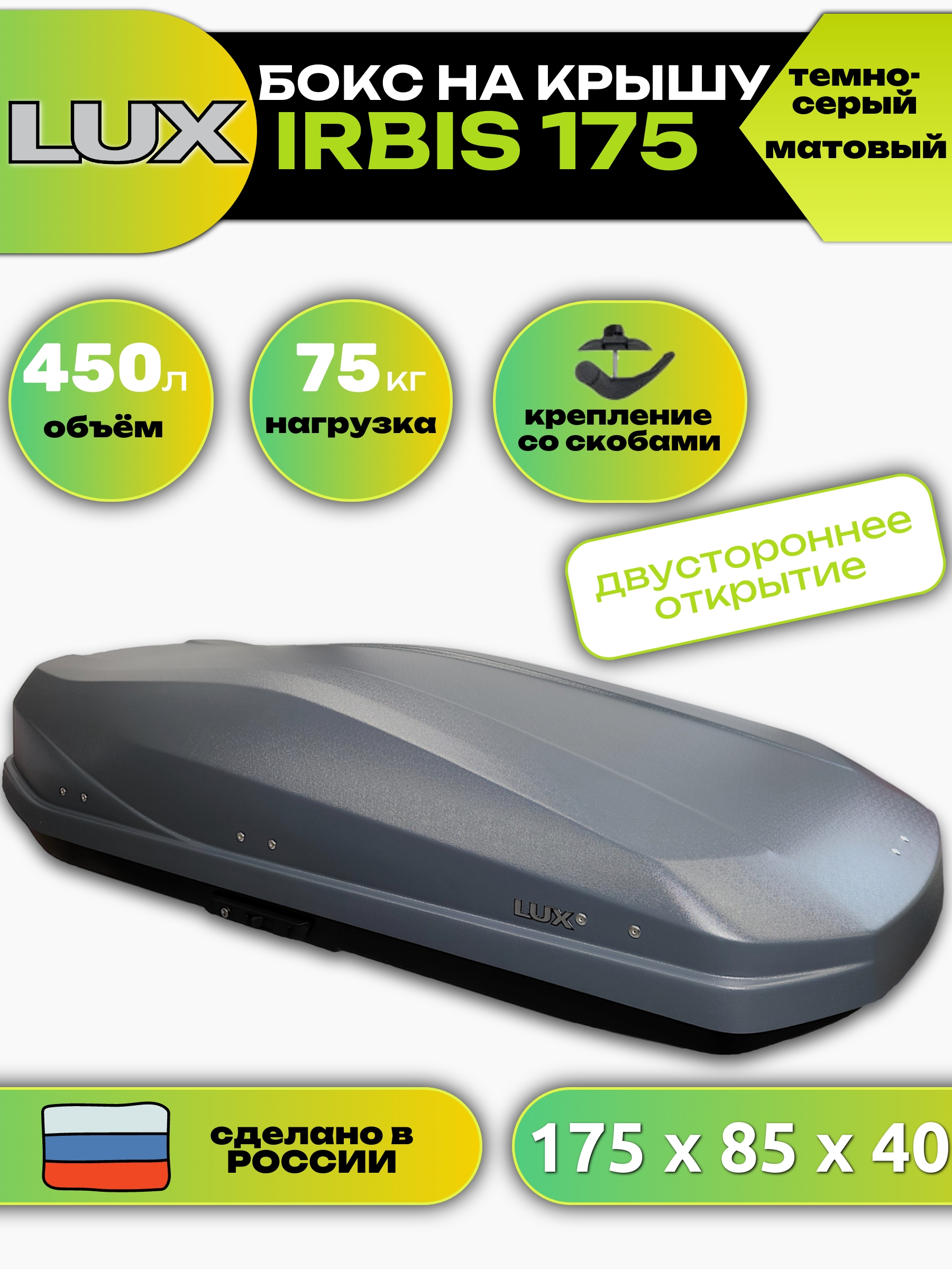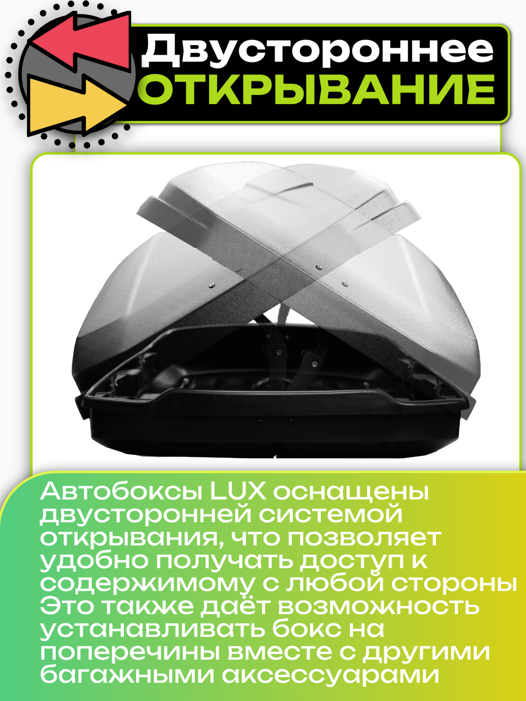 Бокс LUX IRBIS оснащён двусторонней системой открывания, что позволяет легко доставать его содержимое бокса как со стороны пассажира, так и со стороны водителя.