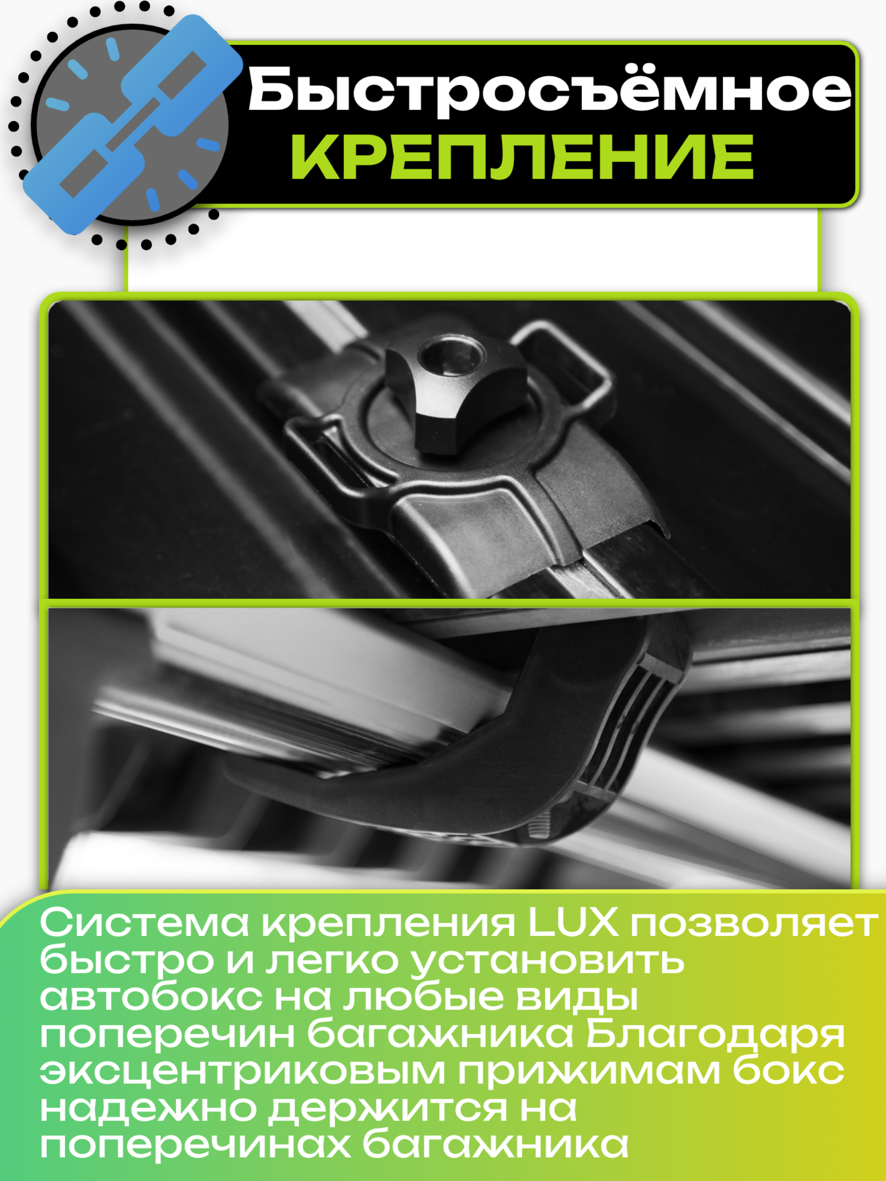 Быстросъемный крепеж позволяет быстро, удобно и надежно установить или снять бокс.