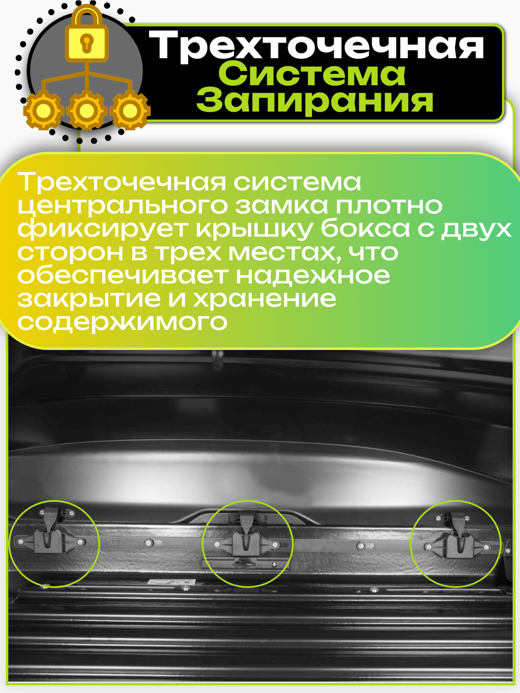 Бокс LUX IRBIS оборудован специальной шести-точечной системой запирания с защитой от неправильного закрытия. Ключ из замка возможно вынуть только когда все элементы системы запирания надёжно закрыты, а это обеспечивает дополнительную безопасность при езде с данным боксом.