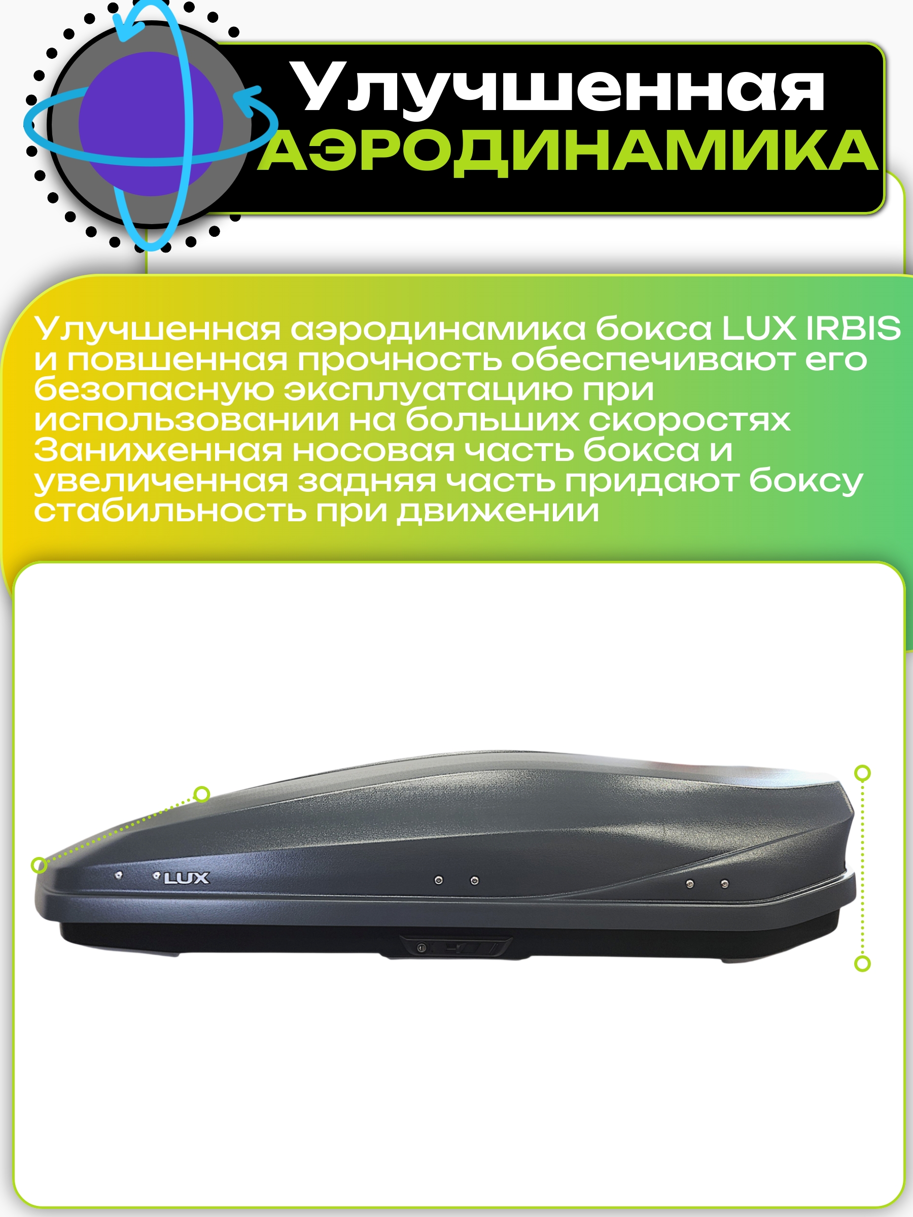 А прекрасные аэродинамические качества автобокса LUX IRBIS делают езду с данным боксом тиxой и комфортной.