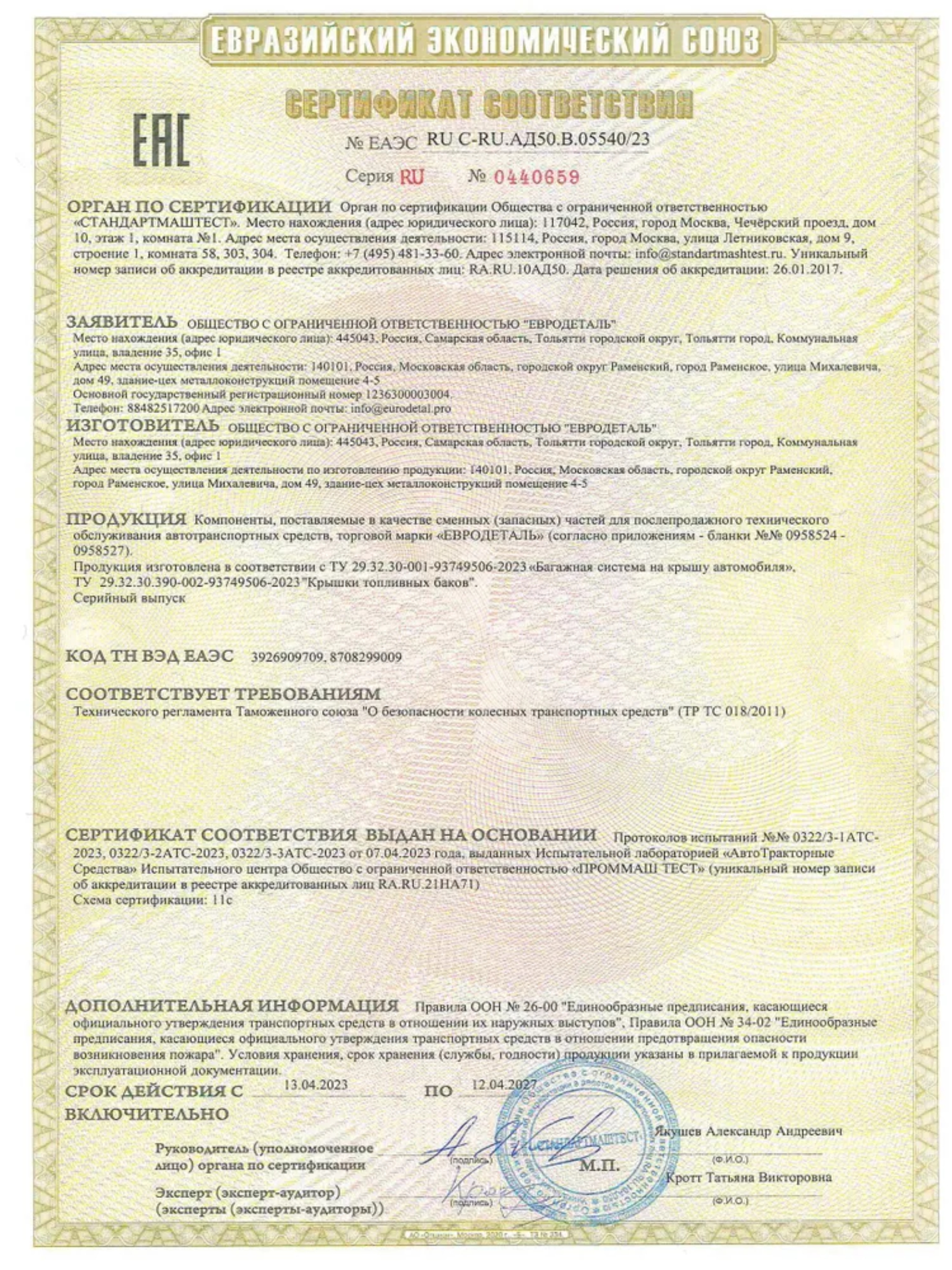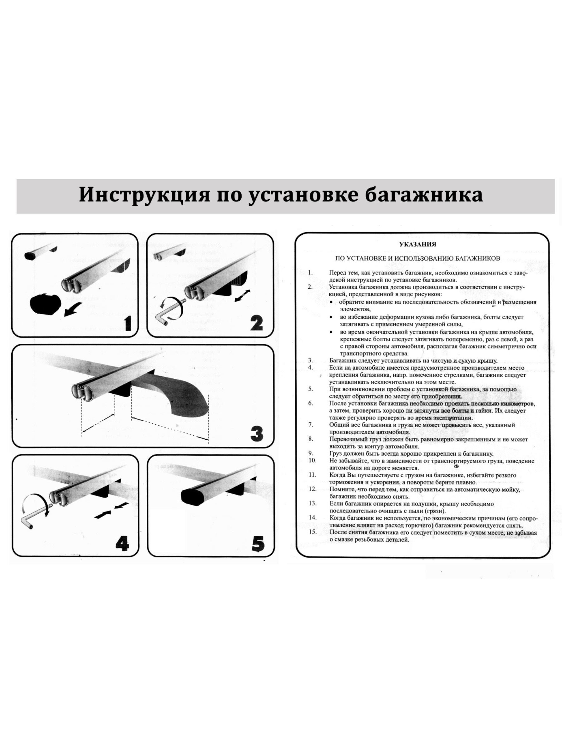 Максимальная допустимая нагрузка на багажник 75 кг. ВНИМАНИЕ!!!! Перед использованием багажника уточняйте максимально допустимую нагрузку на кузов вашего автомобиля у производителя автомобиля. Она может отличаться от максимально допустимой нагрузки на багажник. Помните, что максимальная нагрузка на кузов автомобиля состоит из веса самого багажника + веса дополнительного багажного аксессуара (при наличии) + веса самого груза.