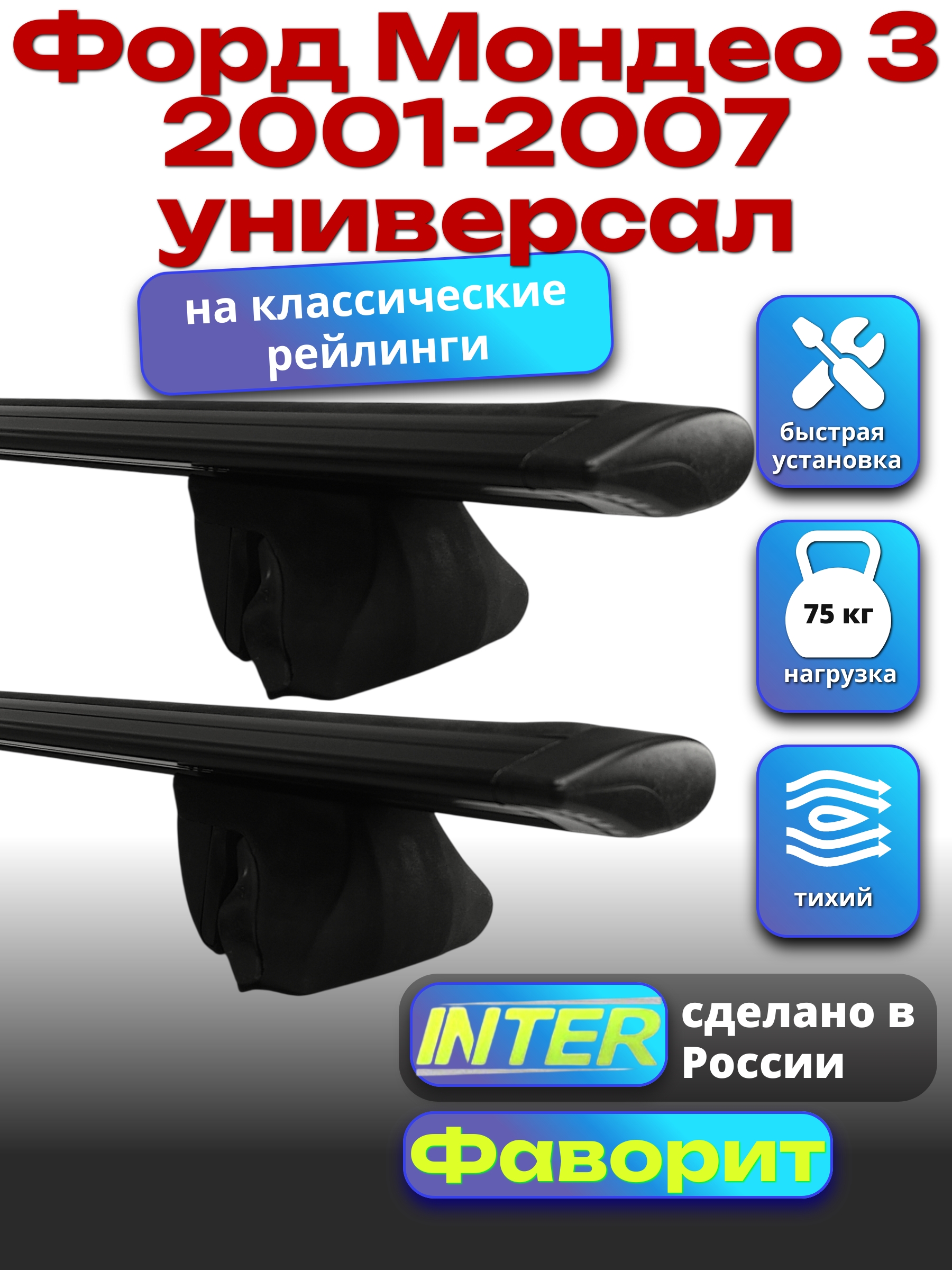 Багажник на крышу INTER Фаворит для Форд Мондео 3 2001-2007 универсал — разработка российского производителя. Если вы подбираете недорогой и качественный багажник для своего автомобиля — это то, что вам необходимо.