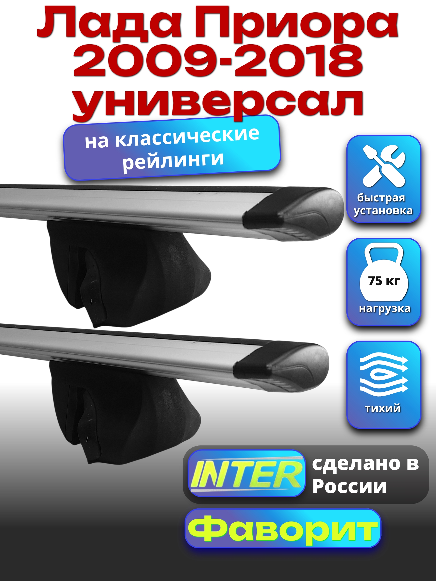 INTER Фаворит предназначен для автомобилей с классическими рейлингами (просвет между крышей автомобиля и рейлинга). Крепление осуществляется на рейлинги при помощи затягивания.