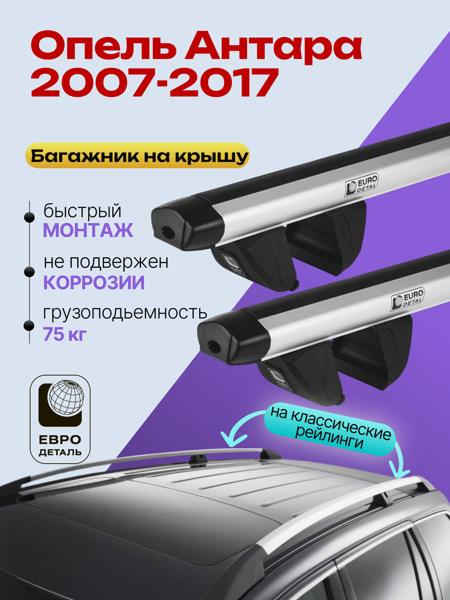 Багажник на крышу ЕвроДеталь Compact для Опель Антара 2007-2017 — это качественное и доступное решение для перевозки грузов, разработанное российским производителем. Идеален для тех, кто ищет надежный и недорогой багажник для своего автомобиля.