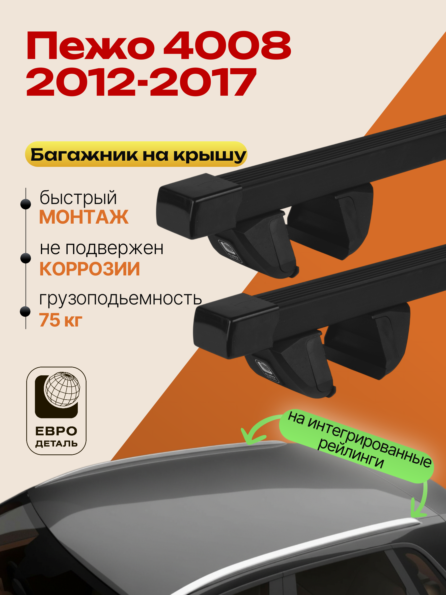Багажник на крышу ЕвроДеталь Compact для Пежо 4008 2012-2017 (Рейлинги без просвета) — это качественное и доступное решение для перевозки грузов, разработанное российским производителем. Идеален для тех, кто ищет надежный и недорогой багажник для своего автомобиля.