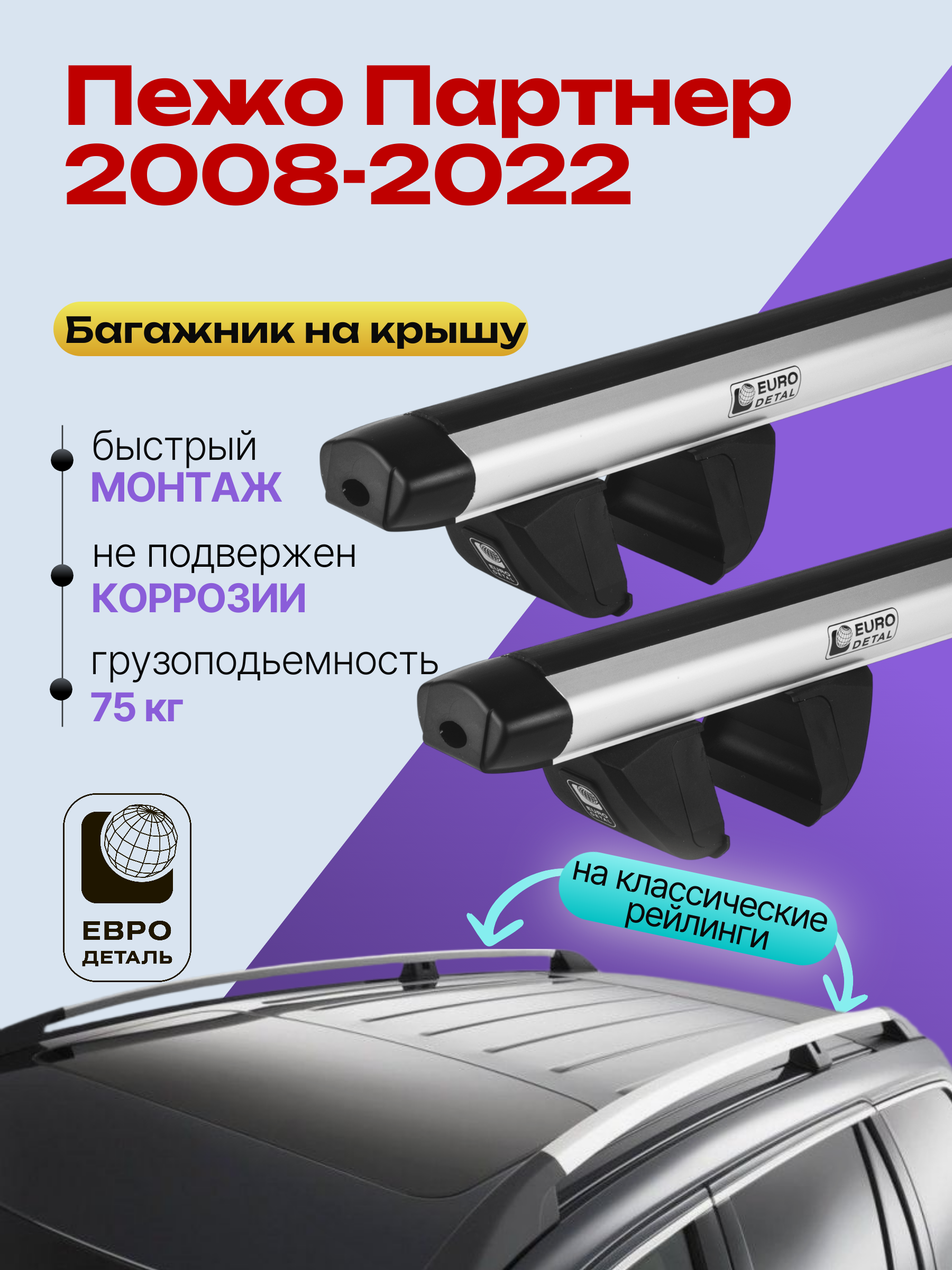 Багажник на крышу ЕвроДеталь Compact для Пежо Партнер 2008-2022 (Рейлинги с просветом) — это качественное и доступное решение для перевозки грузов, разработанное российским производителем. Идеален для тех, кто ищет надежный и недорогой багажник для своего автомобиля.