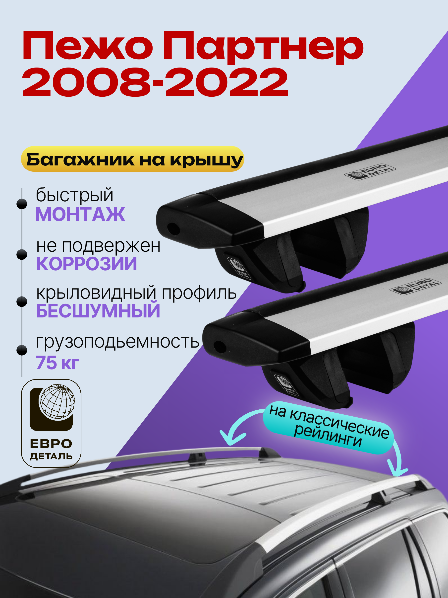 Багажник на крышу ЕвроДеталь Compact для Пежо Партнер 2008-2022 (Рейлинги с просветом) — это качественное и доступное решение для перевозки грузов, разработанное российским производителем. Идеален для тех, кто ищет надежный и недорогой багажник для своего автомобиля.