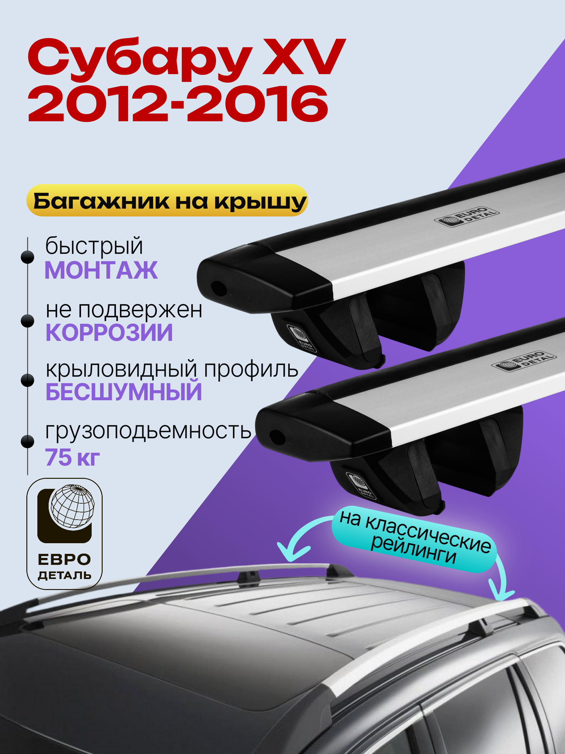 Багажник на крышу ЕвроДеталь Compact для Субару XV 2012-2016 (Рейлинги с просветом) — это качественное и доступное решение для перевозки грузов, разработанное российским производителем. Идеален для тех, кто ищет надежный и недорогой багажник для своего автомобиля.