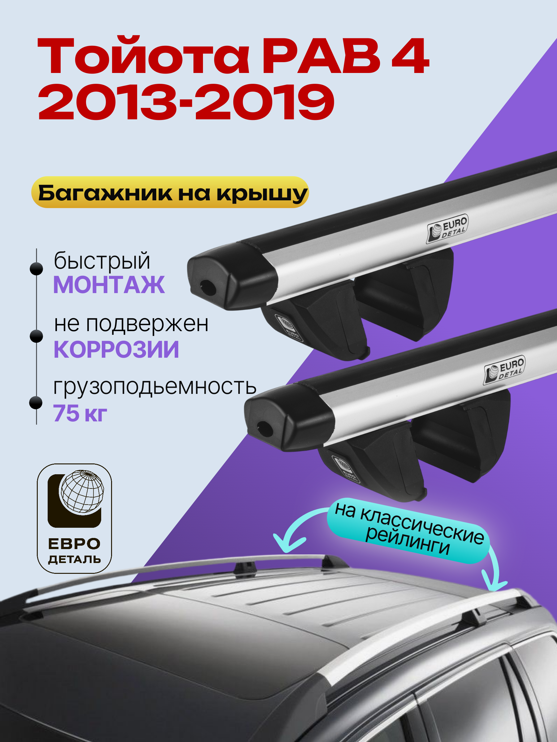 Багажник на крышу ЕвроДеталь Compact для Тойота РАВ 4 2013-2019 (Рейлинги с просветом) — это качественное и доступное решение для перевозки грузов, разработанное российским производителем. Идеален для тех, кто ищет надежный и недорогой багажник для своего автомобиля.