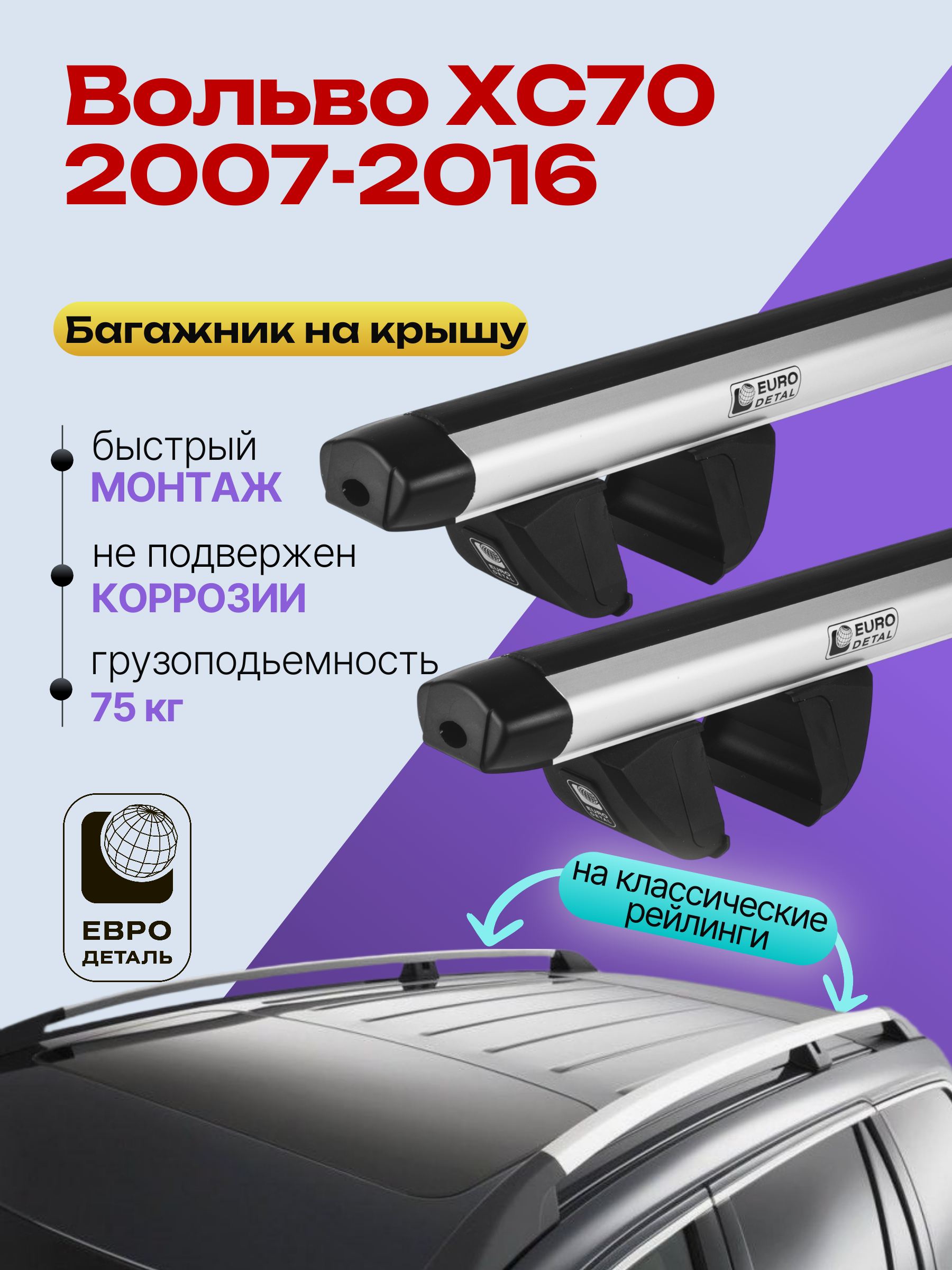 Багажник на крышу ЕвроДеталь Compact для Вольво ХС70 2007-2016 — это качественное и доступное решение для перевозки грузов, разработанное российским производителем. Идеален для тех, кто ищет надежный и недорогой багажник для своего автомобиля.