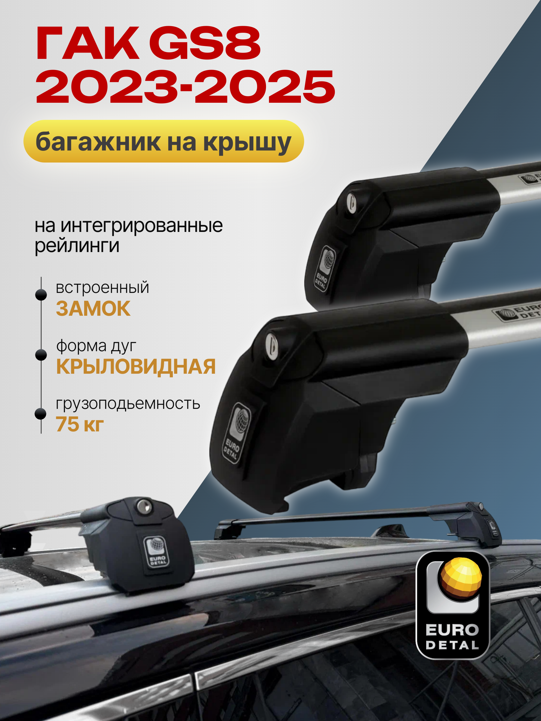 Багажник на крышу ЕвроДеталь SMART I предназначен для установки на ГАК GS8 2023-2025 с интегрированными рейлингами.