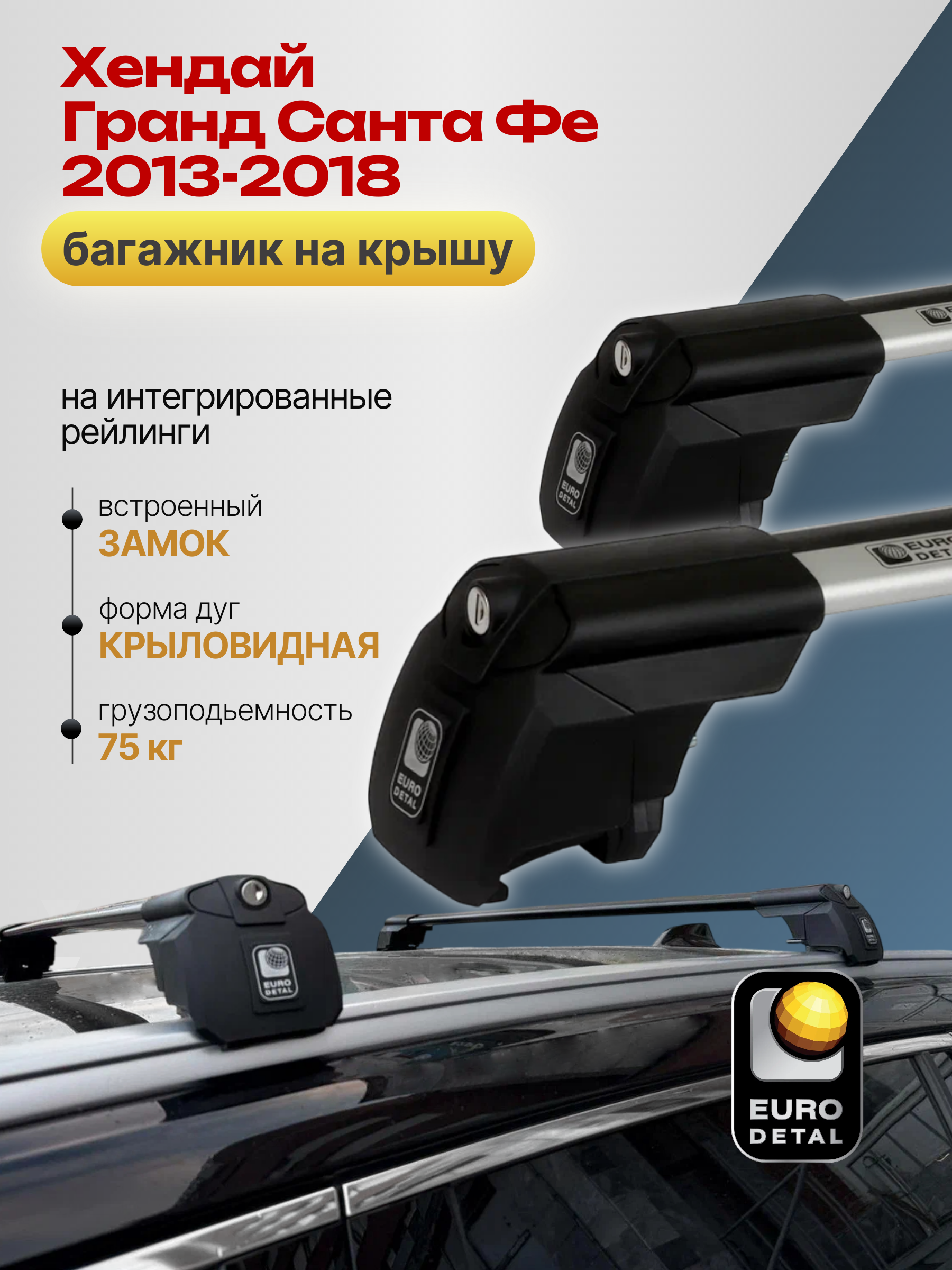 Багажник на крышу ЕвроДеталь SMART I предназначен для установки на Хендай Гранд Санта Фе 2013-2018 с интегрированными рейлингами.
