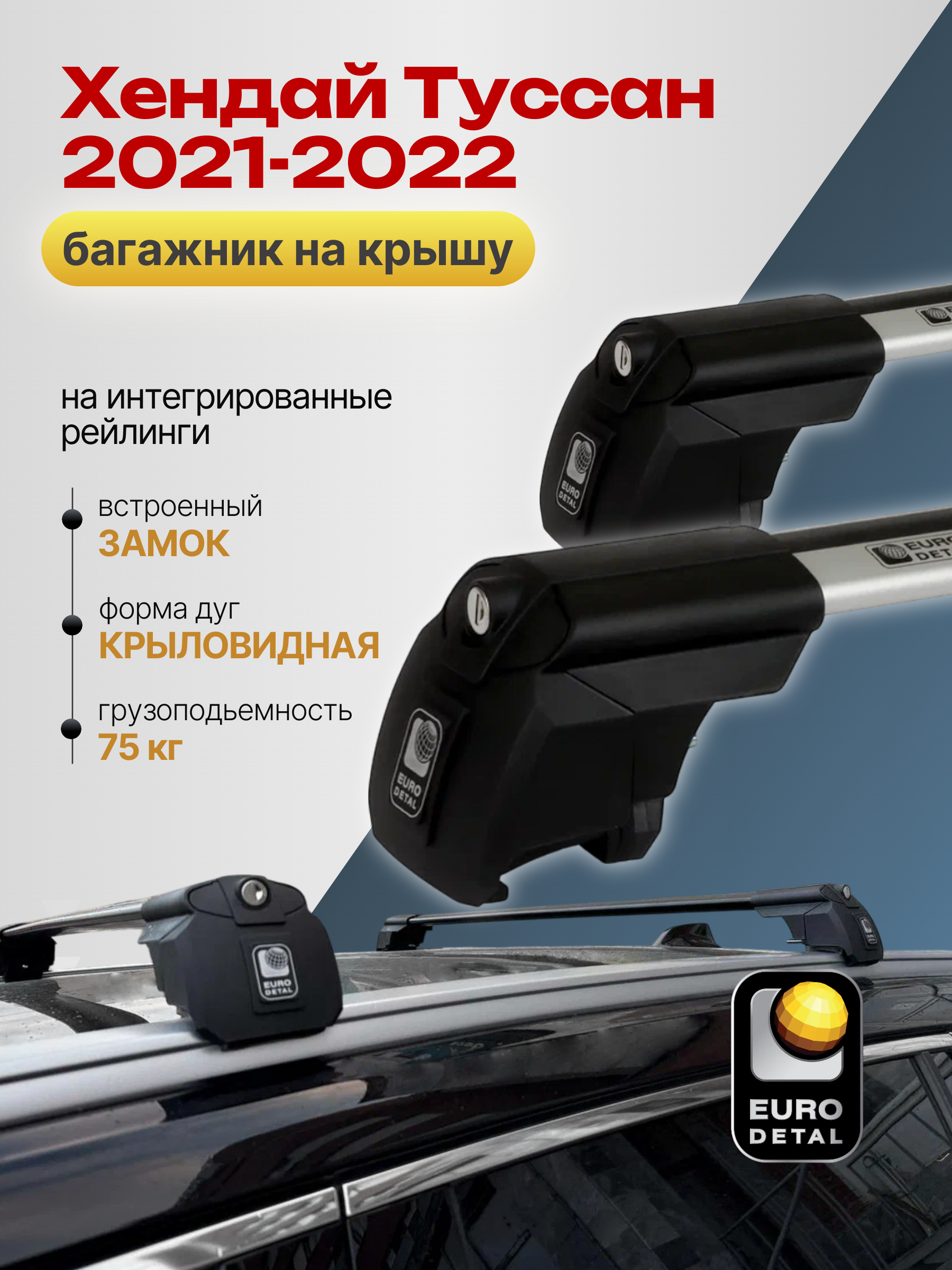 Багажник на крышу ЕвроДеталь SMART I предназначен для установки на Хендай Туссан 2021-2022 с интегрированными рейлингами.