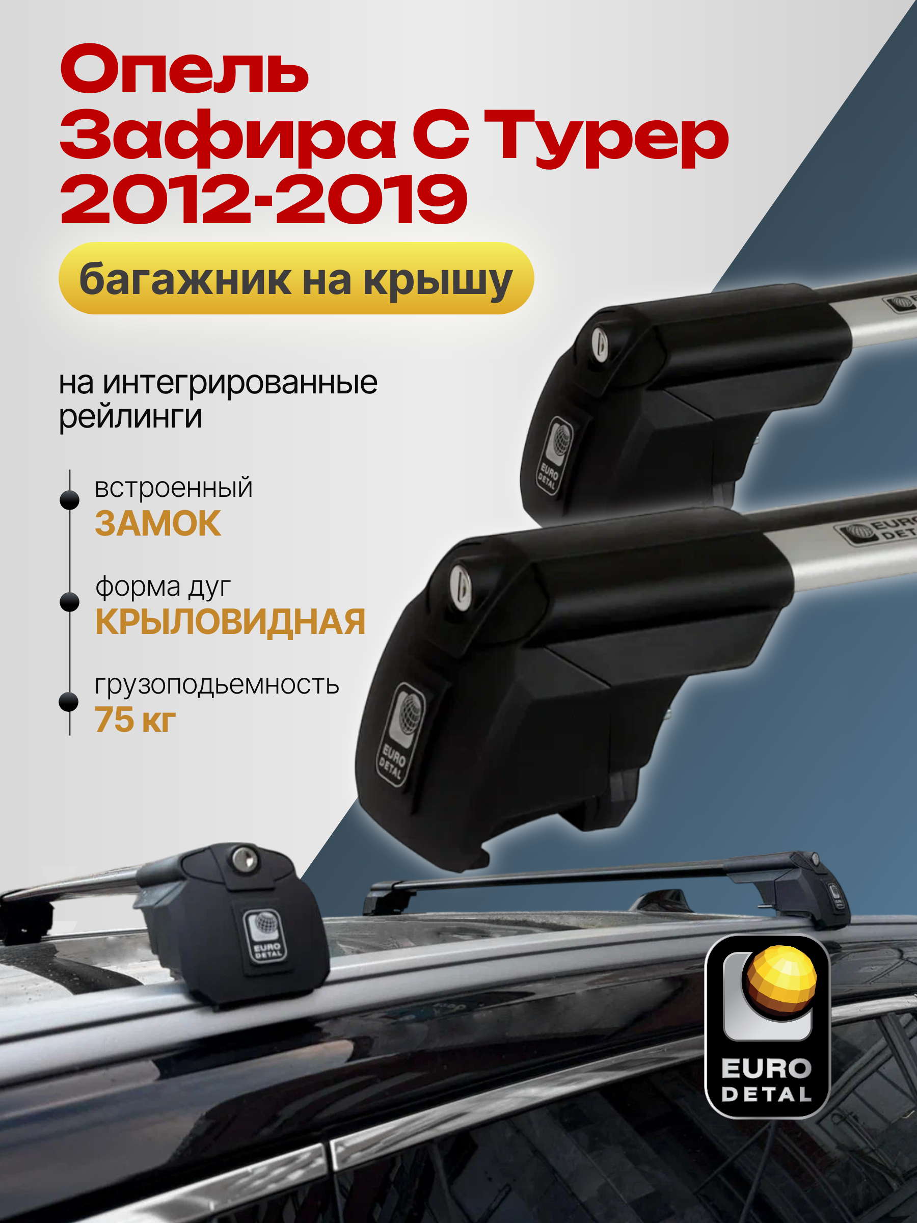 Багажник на крышу ЕвроДеталь SMART I предназначен для установки на Опель Зафира С Турер 2012-2019 с интегрированными рейлингами.