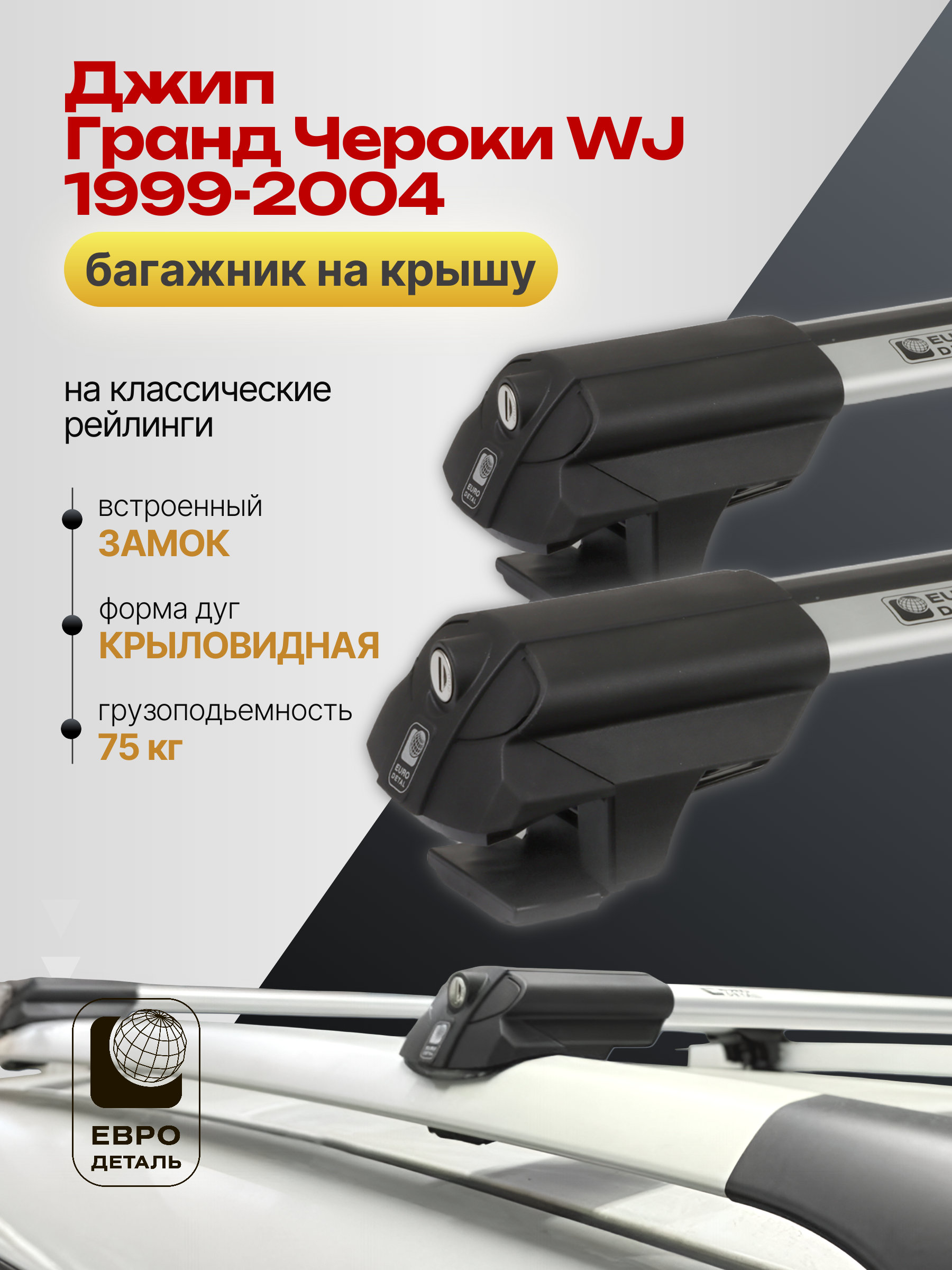 Багажник на крышу ЕвроДеталь SMART S предназначен для установки на Джип Гранд Чероки WJ 1999-2004 со стандартными рейлингами.