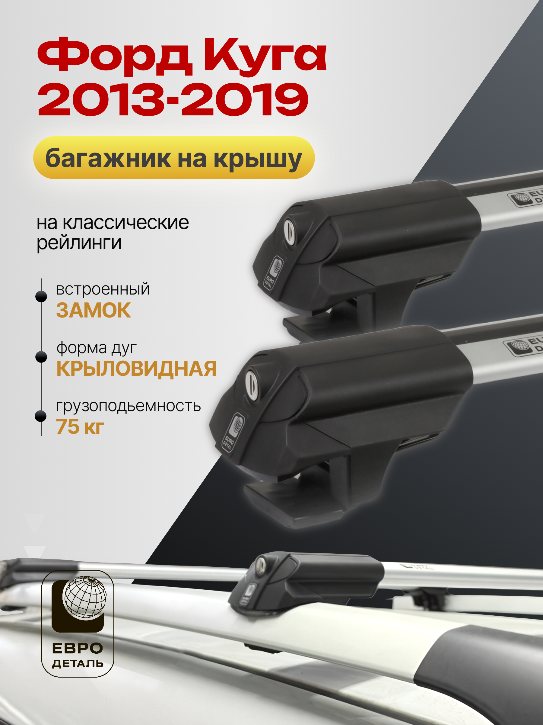 Багажник на крышу ЕвроДеталь SMART S предназначен для установки на Форд Куга 2013-2019 со стандартными рейлингами.