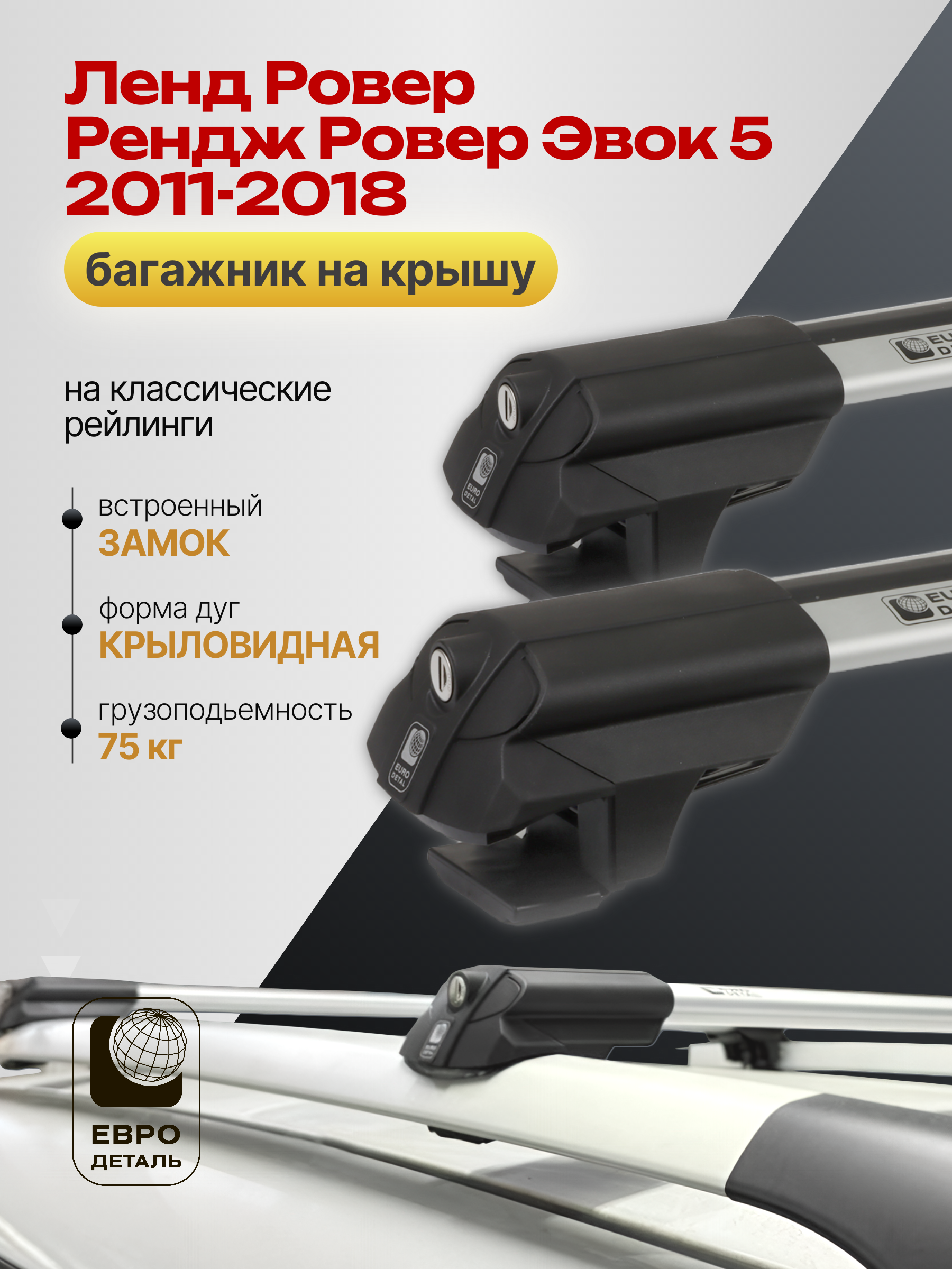 Багажник на крышу ЕвроДеталь SMART S предназначен для установки на Ленд Ровер Рендж Ровер Эвок 5 2011-2018 со стандартными рейлингами.