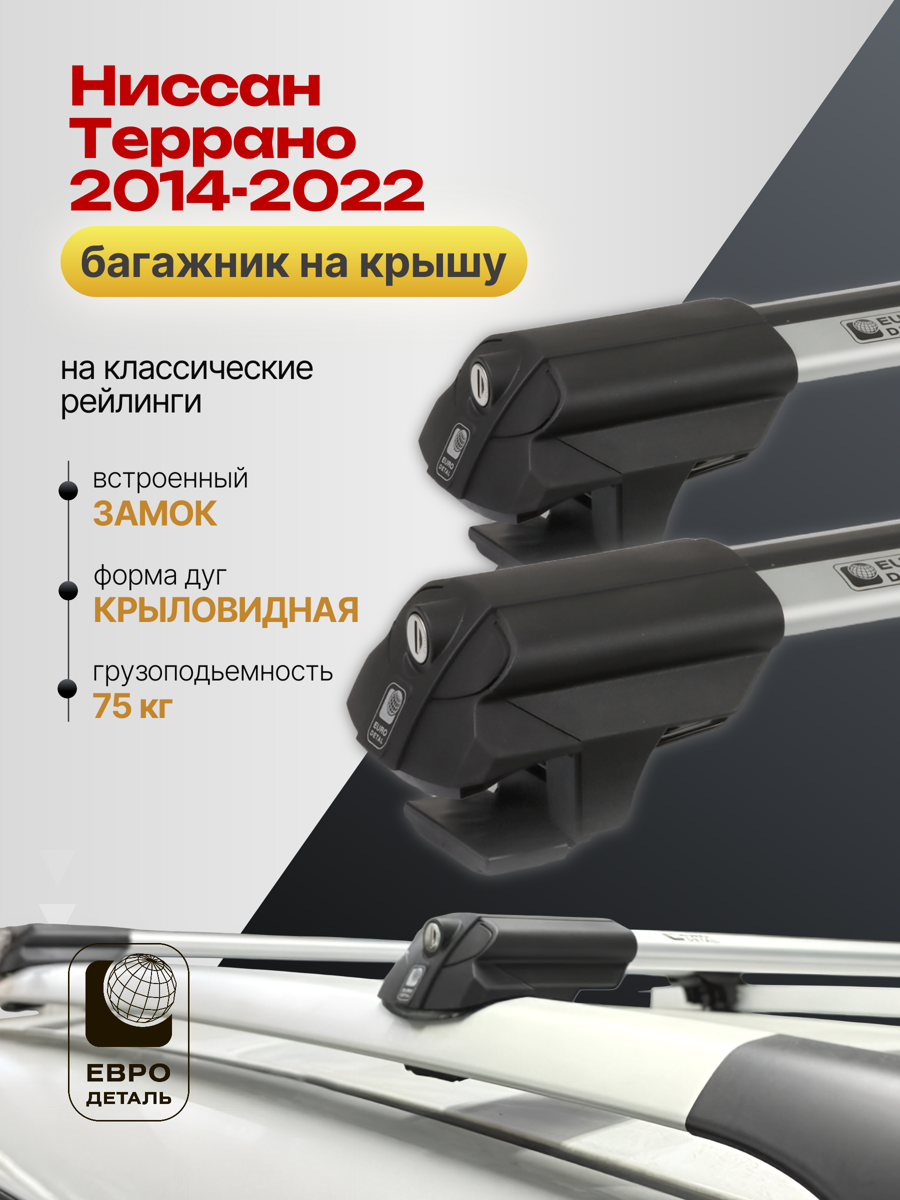 Багажник на крышу ЕвроДеталь SMART S предназначен для установки на Ниссан Террано 2014-2022 со стандартными рейлингами.