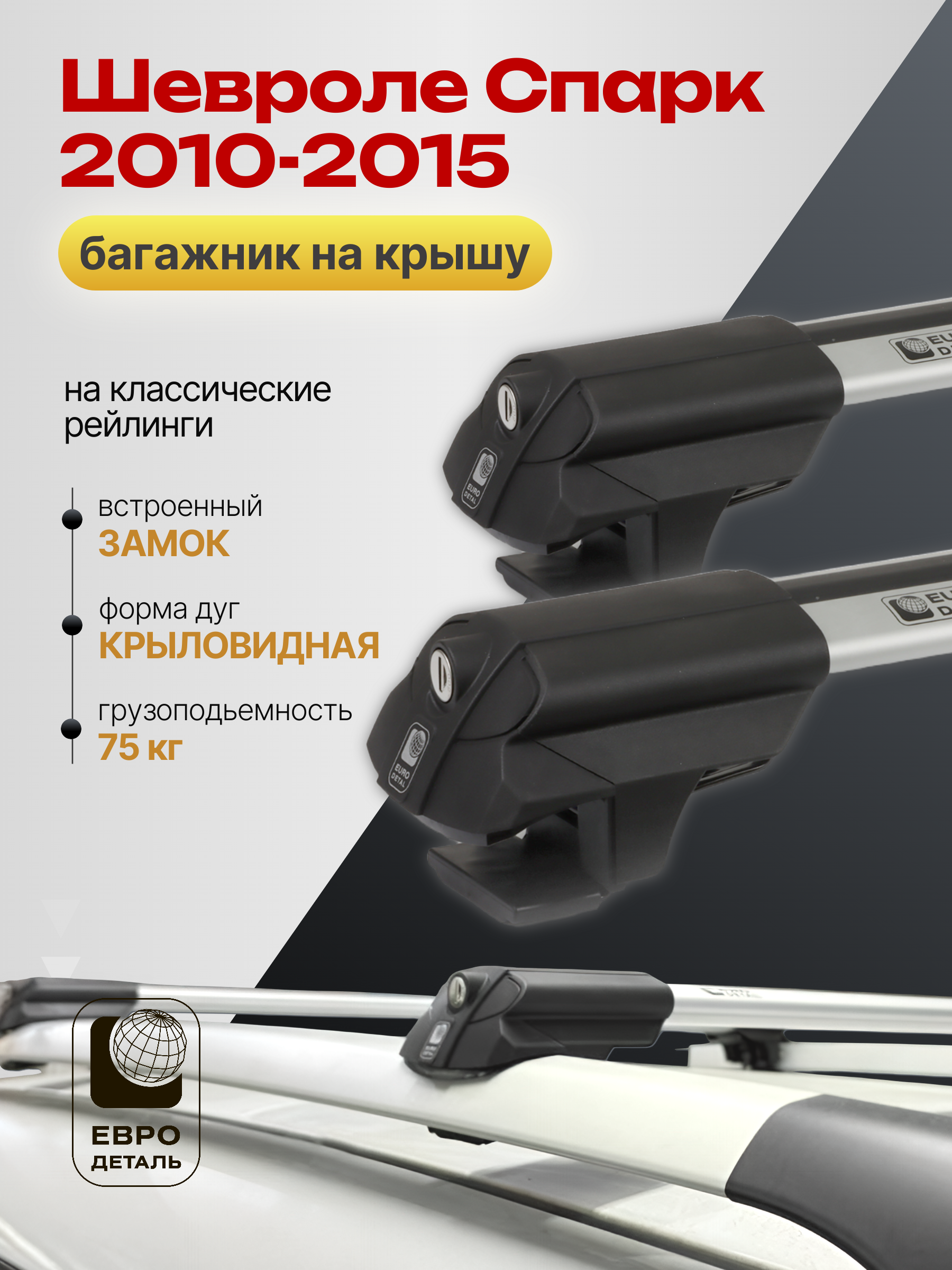 Багажник на крышу ЕвроДеталь SMART S предназначен для установки на Шевроле Спарк 2010-2015 со стандартными рейлингами.