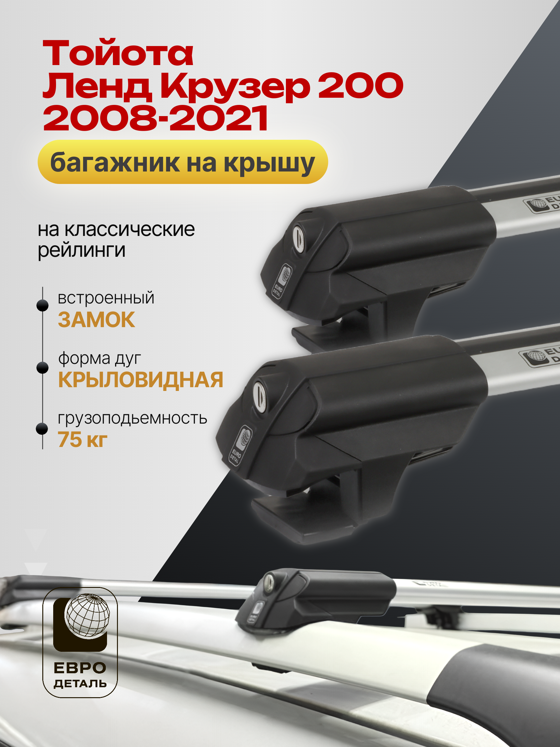 Багажник на крышу ЕвроДеталь SMART S предназначен для установки на Тойота Ленд Крузер 200 2008-2021 со стандартными рейлингами.