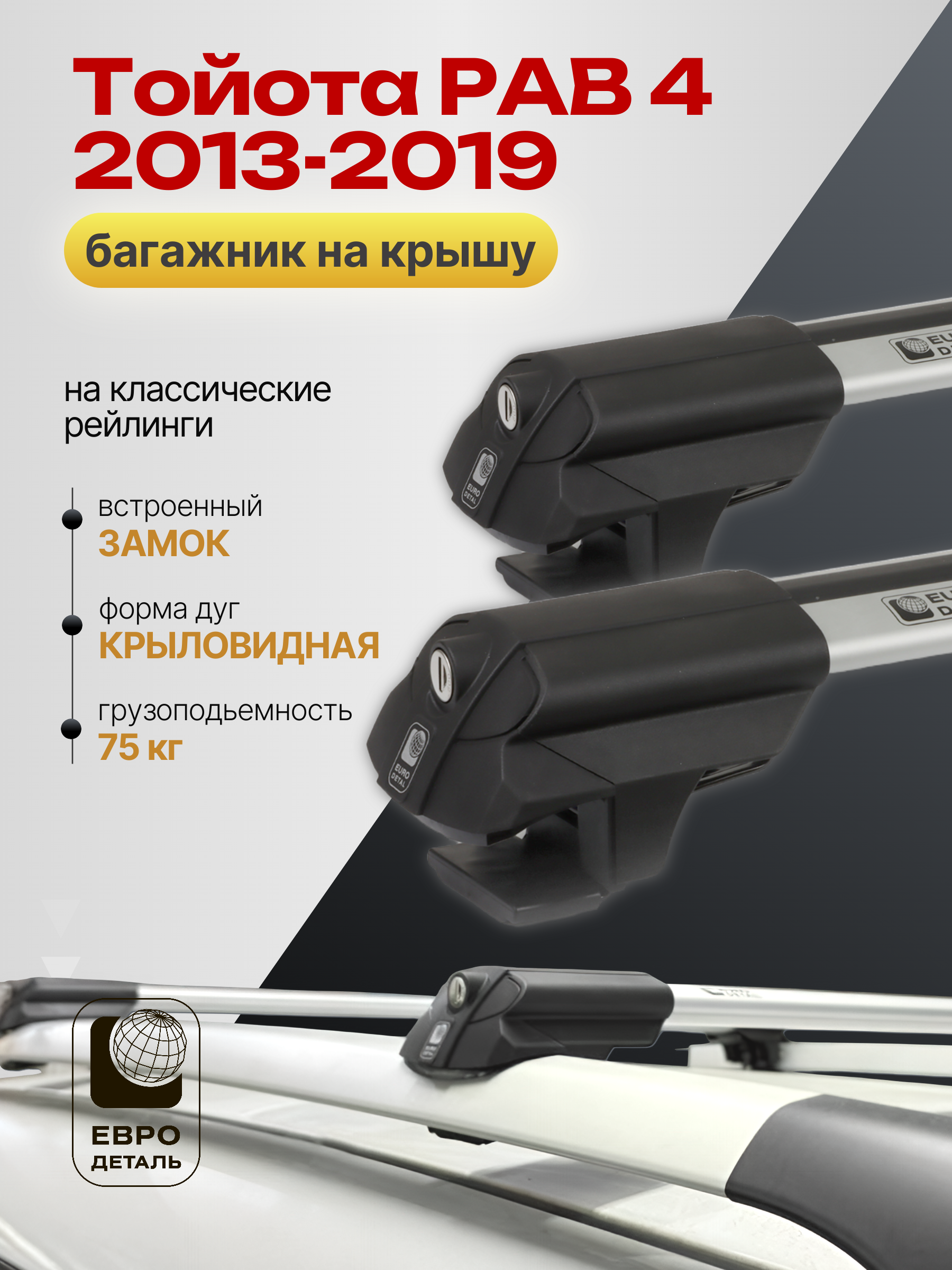Багажник на крышу ЕвроДеталь SMART S предназначен для установки на Тойота РАВ 4 2013-2019 со стандартными рейлингами.