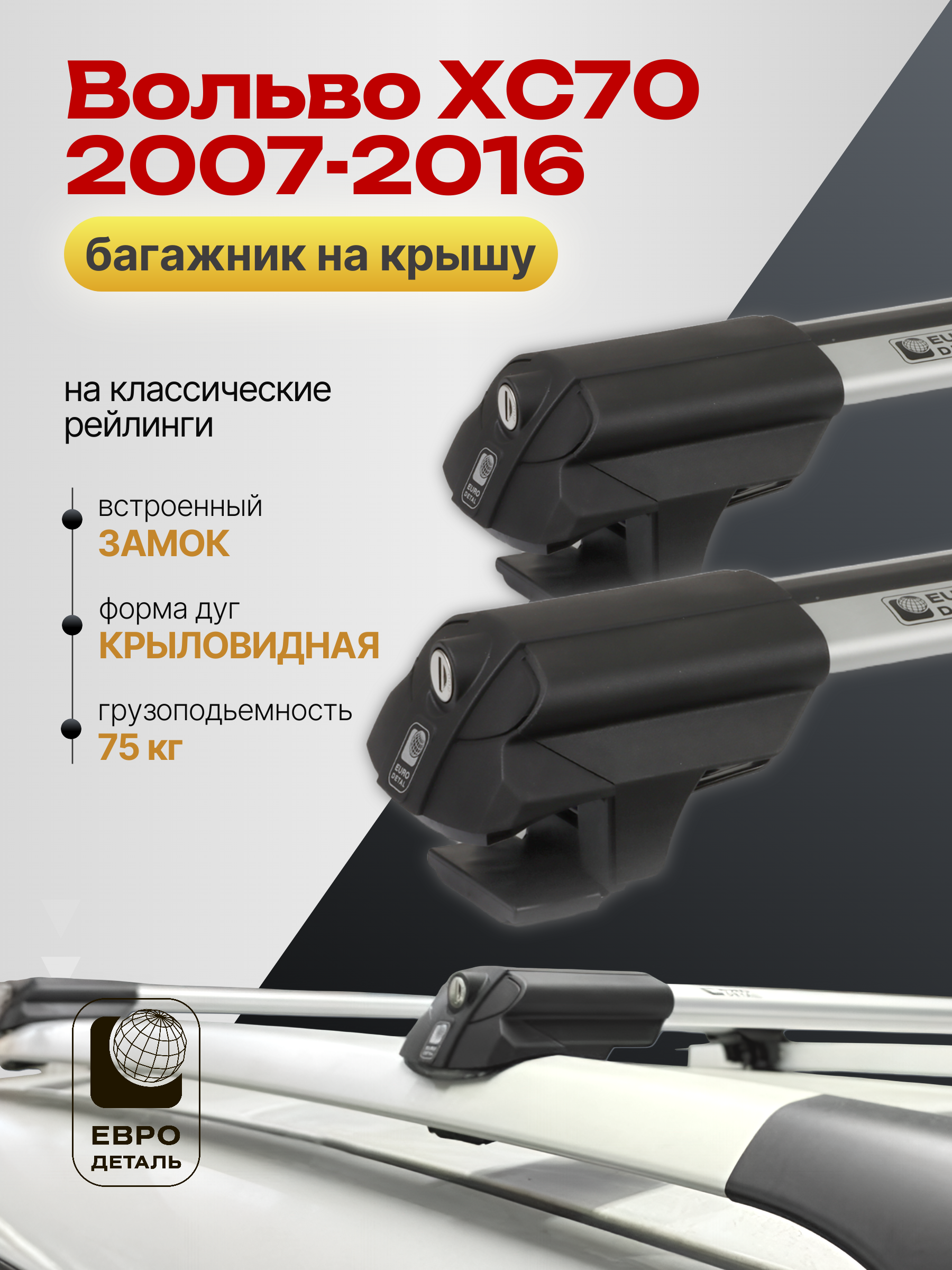 Багажник на крышу ЕвроДеталь SMART S предназначен для установки на Вольво ХС70 2007-2016 со стандартными рейлингами.