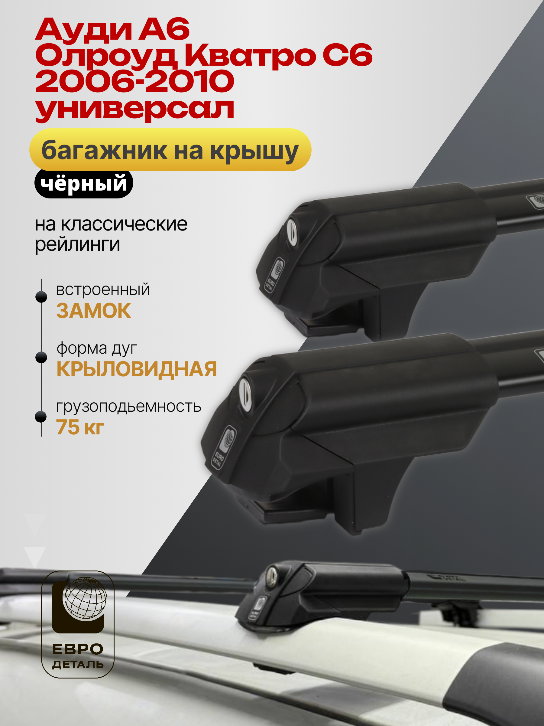 Багажник на крышу ЕвроДеталь SMART S предназначен для установки на Ауди А6 Олроуд Кватро С6 универсал 2006-2010 черный со стандартными рейлингами.