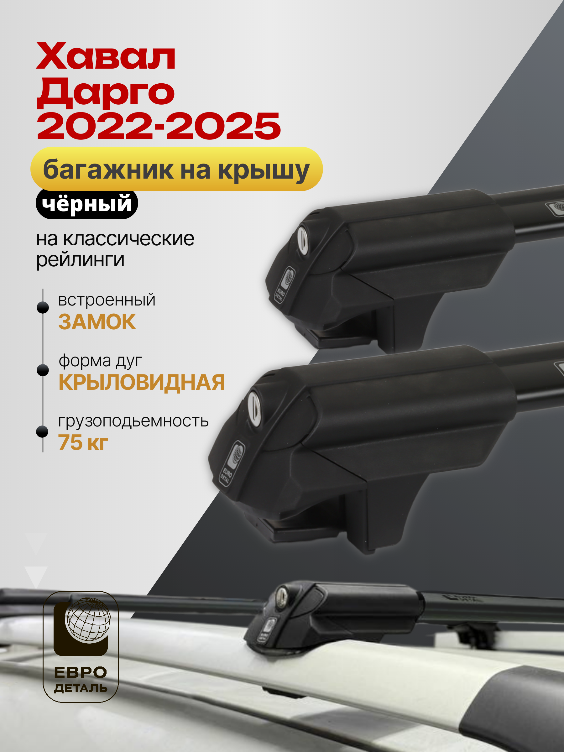 Багажник на крышу ЕвроДеталь SMART S предназначен для установки на Хавал Дарго 2022-2025 черный со стандартными рейлингами.