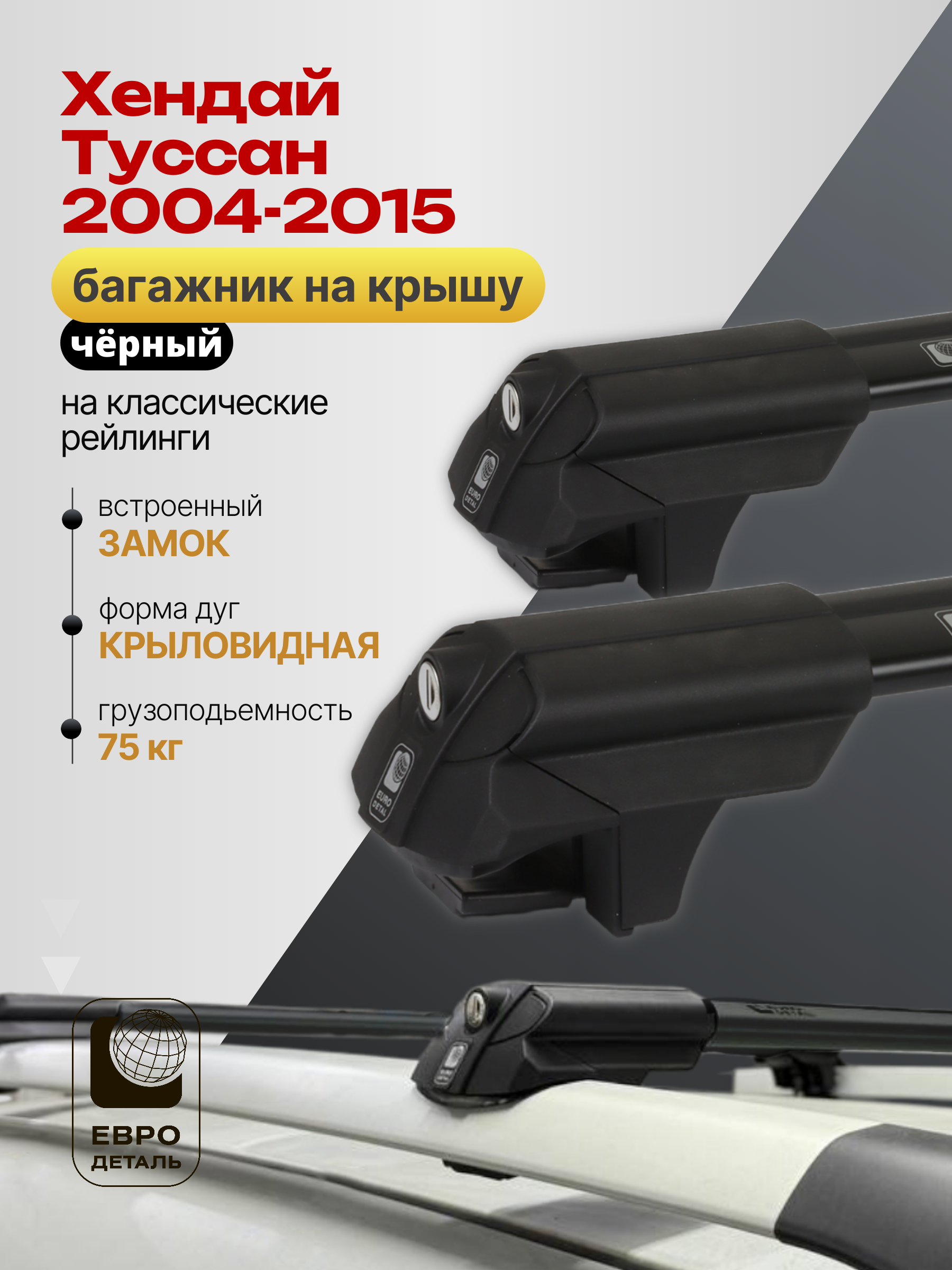 Багажник на крышу ЕвроДеталь SMART S предназначен для установки на Хендай Туссан 2004-2015 черный со стандартными рейлингами.
