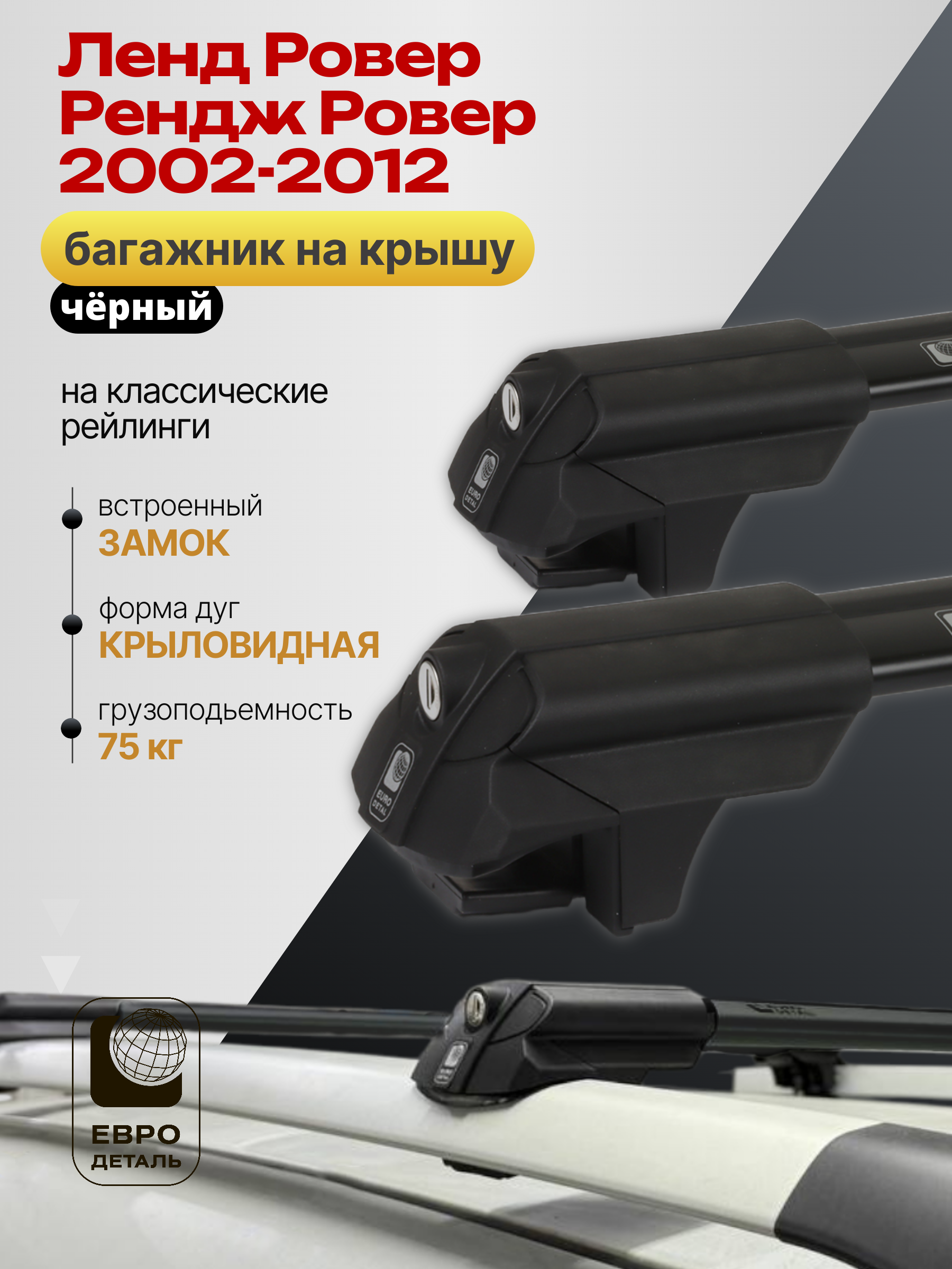 Багажник на крышу ЕвроДеталь SMART S предназначен для установки на Ленд Ровер Рендж Ровер 2002-2012 черный со стандартными рейлингами.