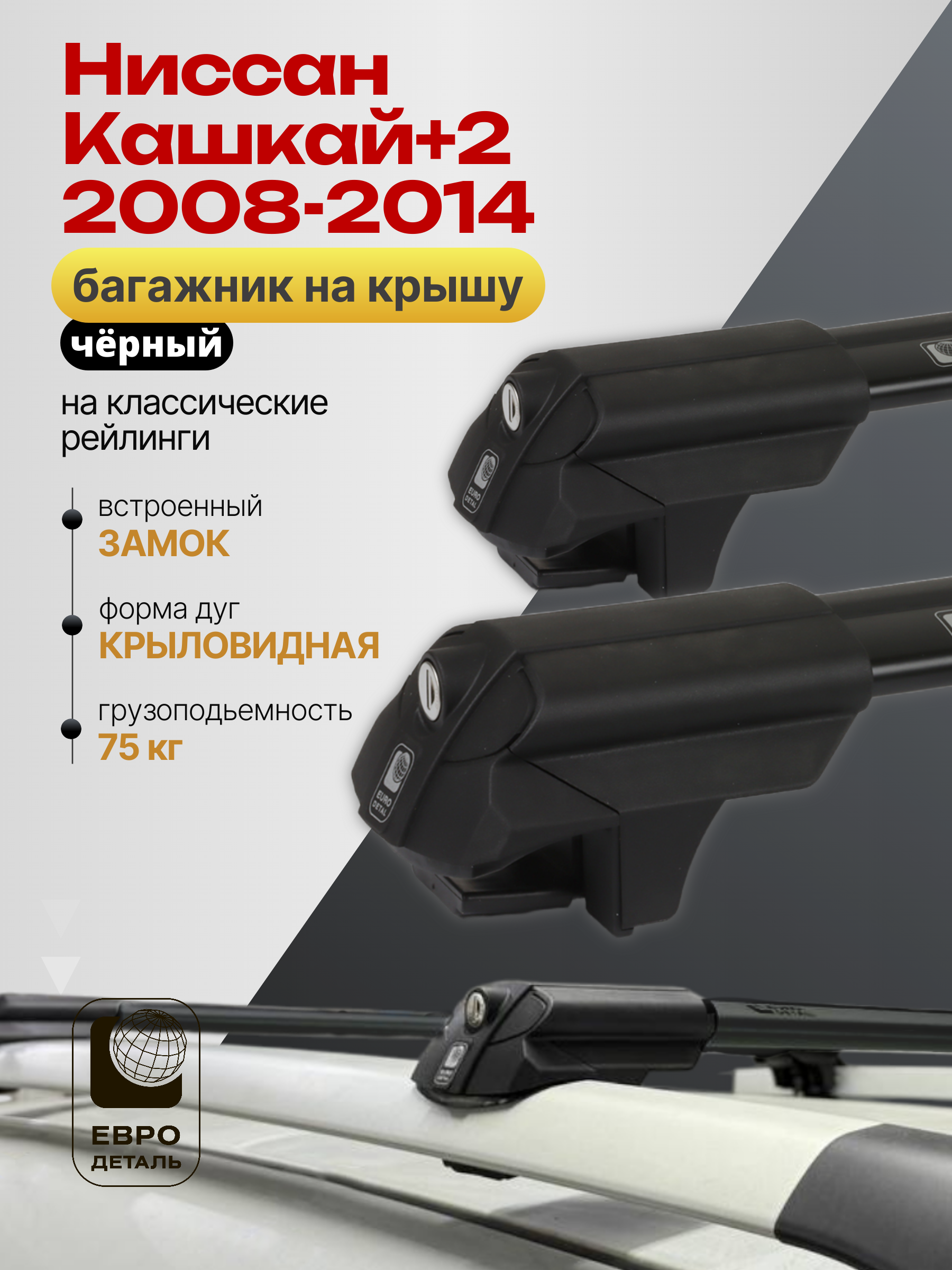 Багажник на крышу ЕвроДеталь SMART S предназначен для установки на Ниссан Кашкай+2 2008-2014 черный со стандартными рейлингами.