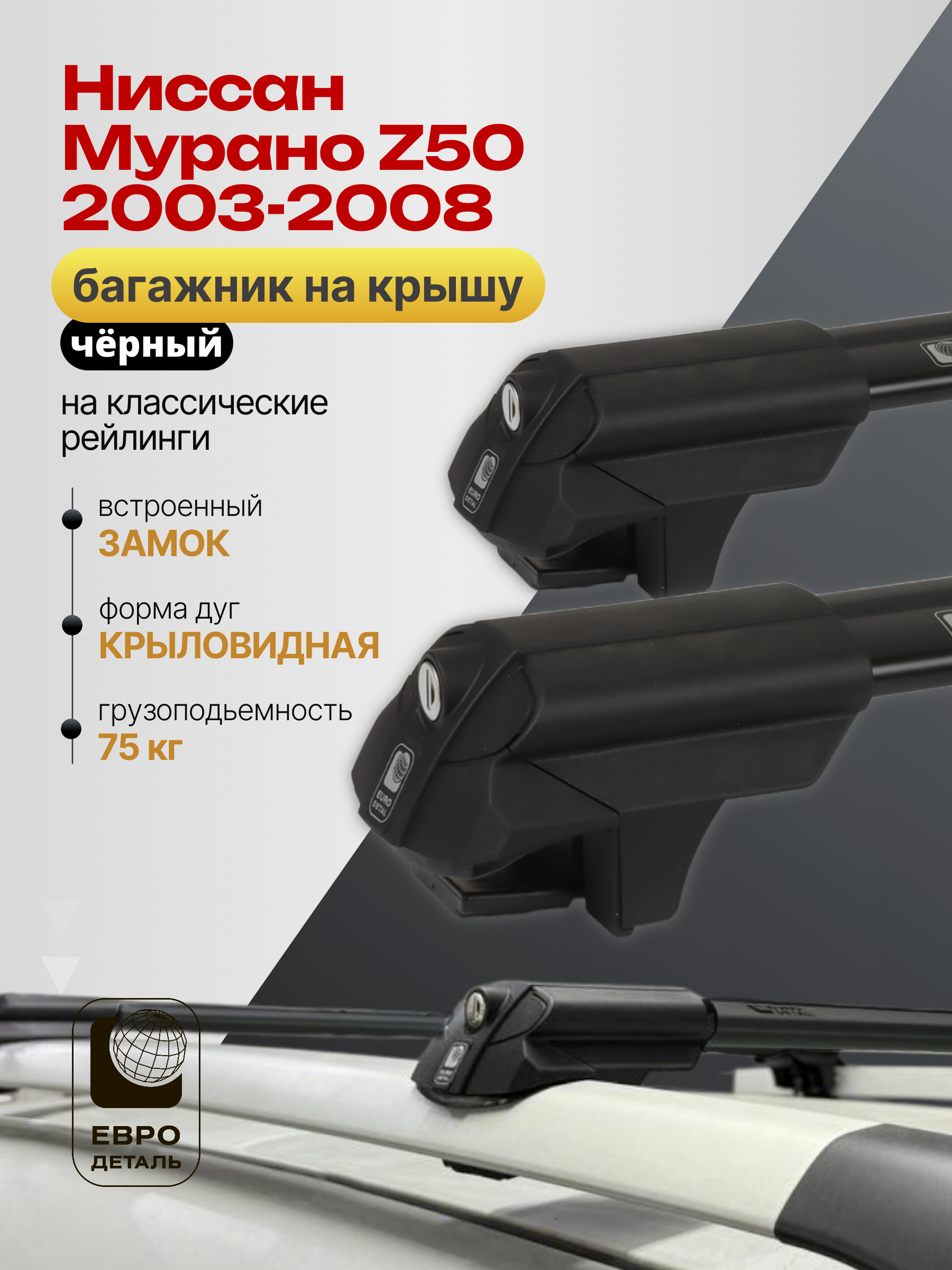 Багажник на крышу ЕвроДеталь SMART S предназначен для установки на Ниссан Мурано Z50 2003-2008 черный со стандартными рейлингами.