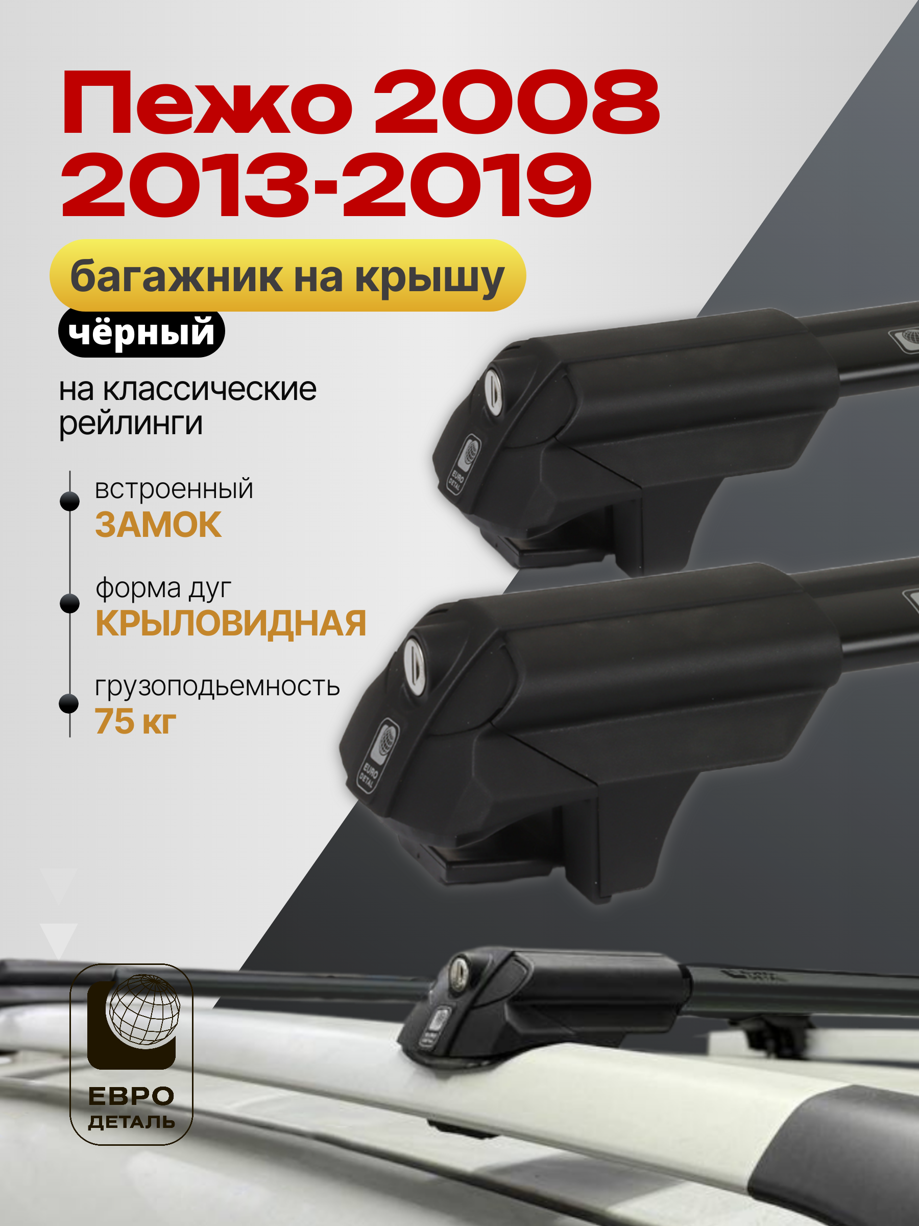 Багажник на крышу ЕвроДеталь SMART S предназначен для установки на Пежо 2008 2013-2019 черный со стандартными рейлингами.