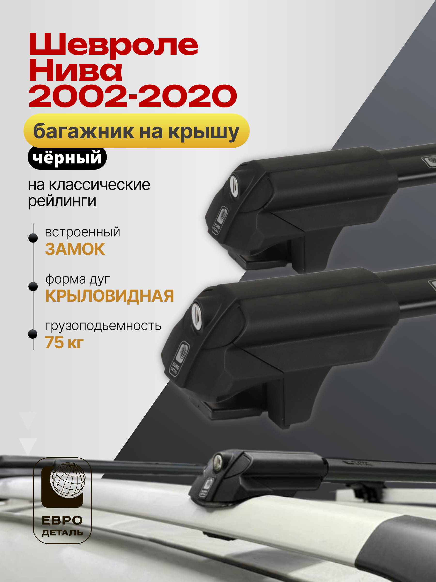 Багажник на крышу ЕвроДеталь SMART S предназначен для установки на Шевроле Нива 2002-2020 черный со стандартными рейлингами.