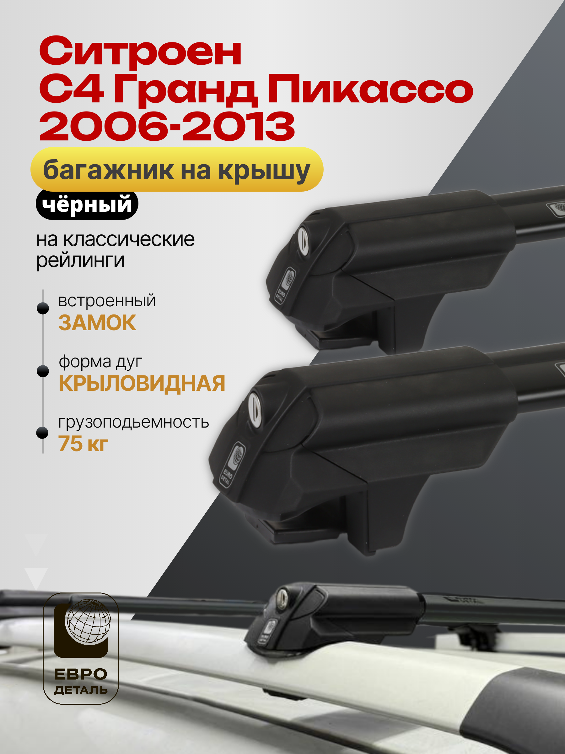Багажник на крышу ЕвроДеталь SMART S предназначен для установки на Ситроен С4 Гранд Пикассо 2006-2013 черный со стандартными рейлингами.