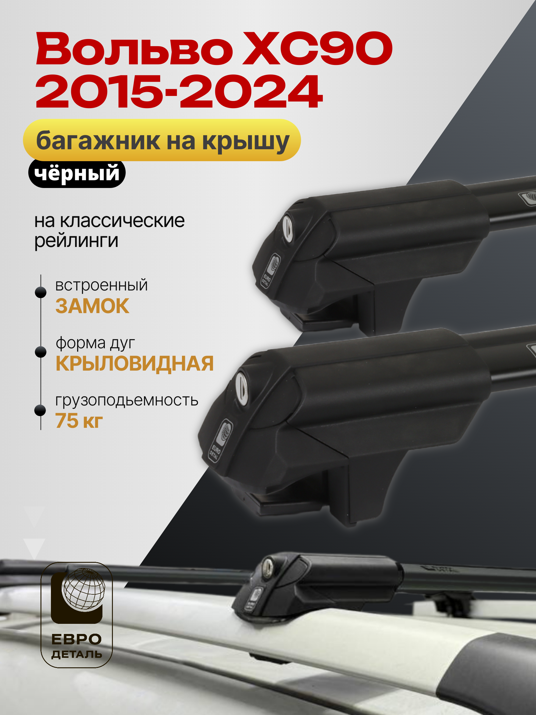 Багажник на крышу ЕвроДеталь SMART S предназначен для установки на Вольво ХС90 2015-2024 черный со стандартными рейлингами.