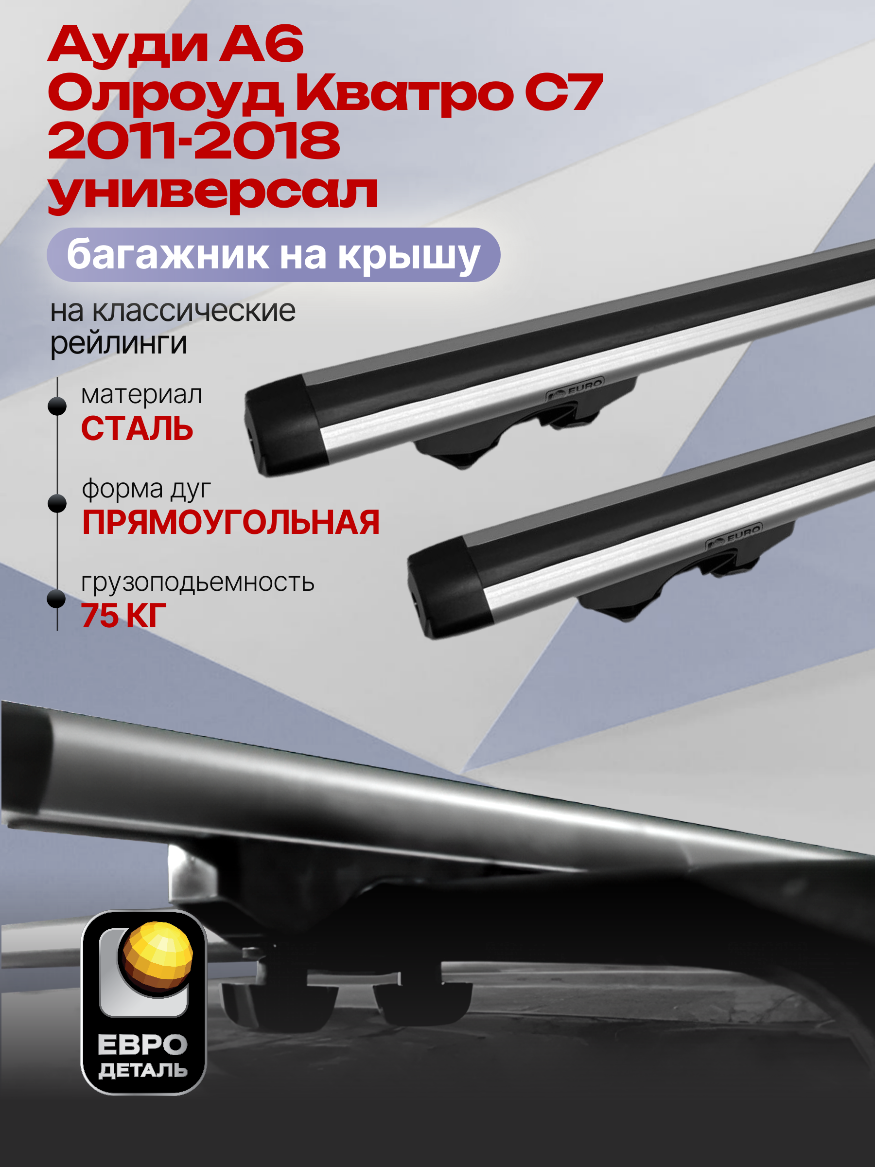Багажник на крышу ЕвроДеталь Start предназначен для установки на Ауди А6 Олроуд Кватро С7 универсал 2011-2018 с классическими рейлингами.