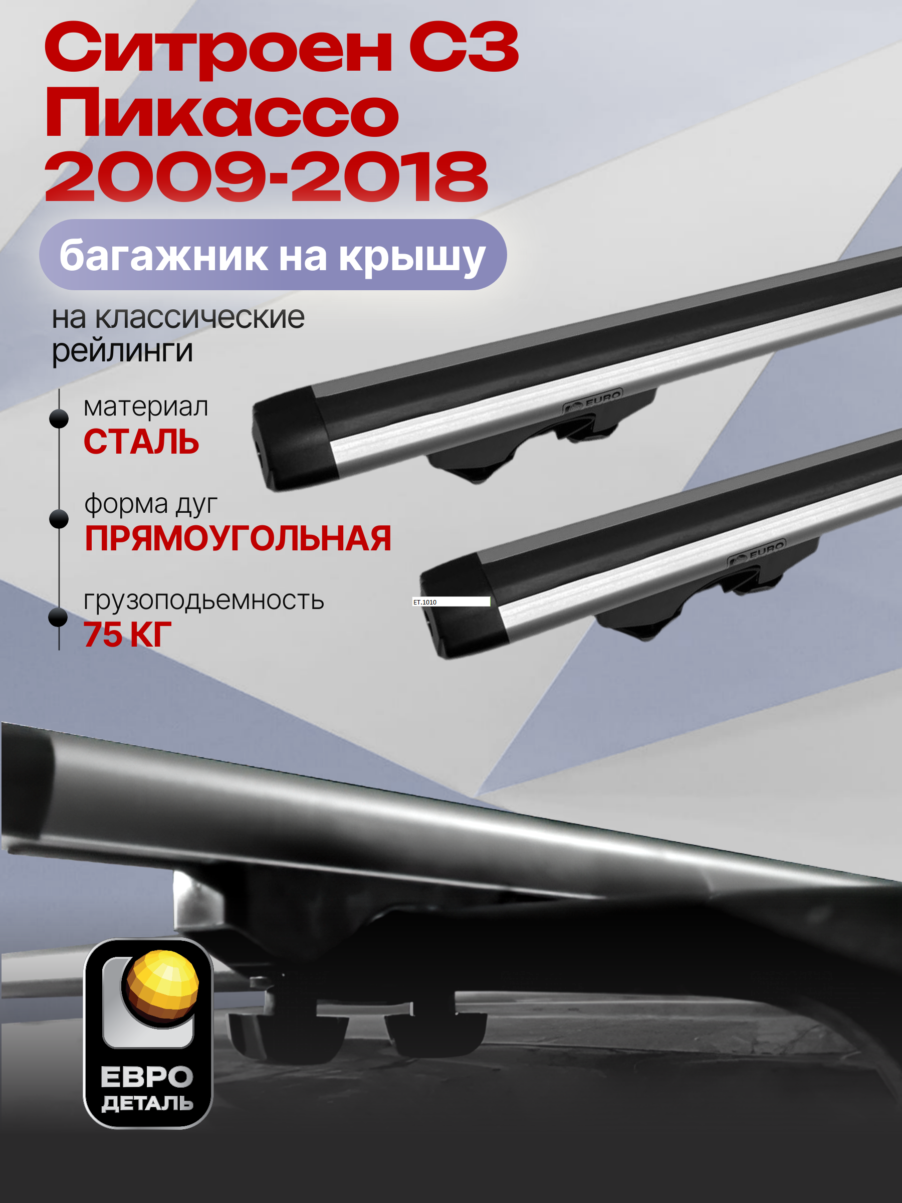 Багажник на крышу ЕвроДеталь Start предназначен для установки на Ситроен С3 Пикассо 2009-2018 с классическими рейлингами.