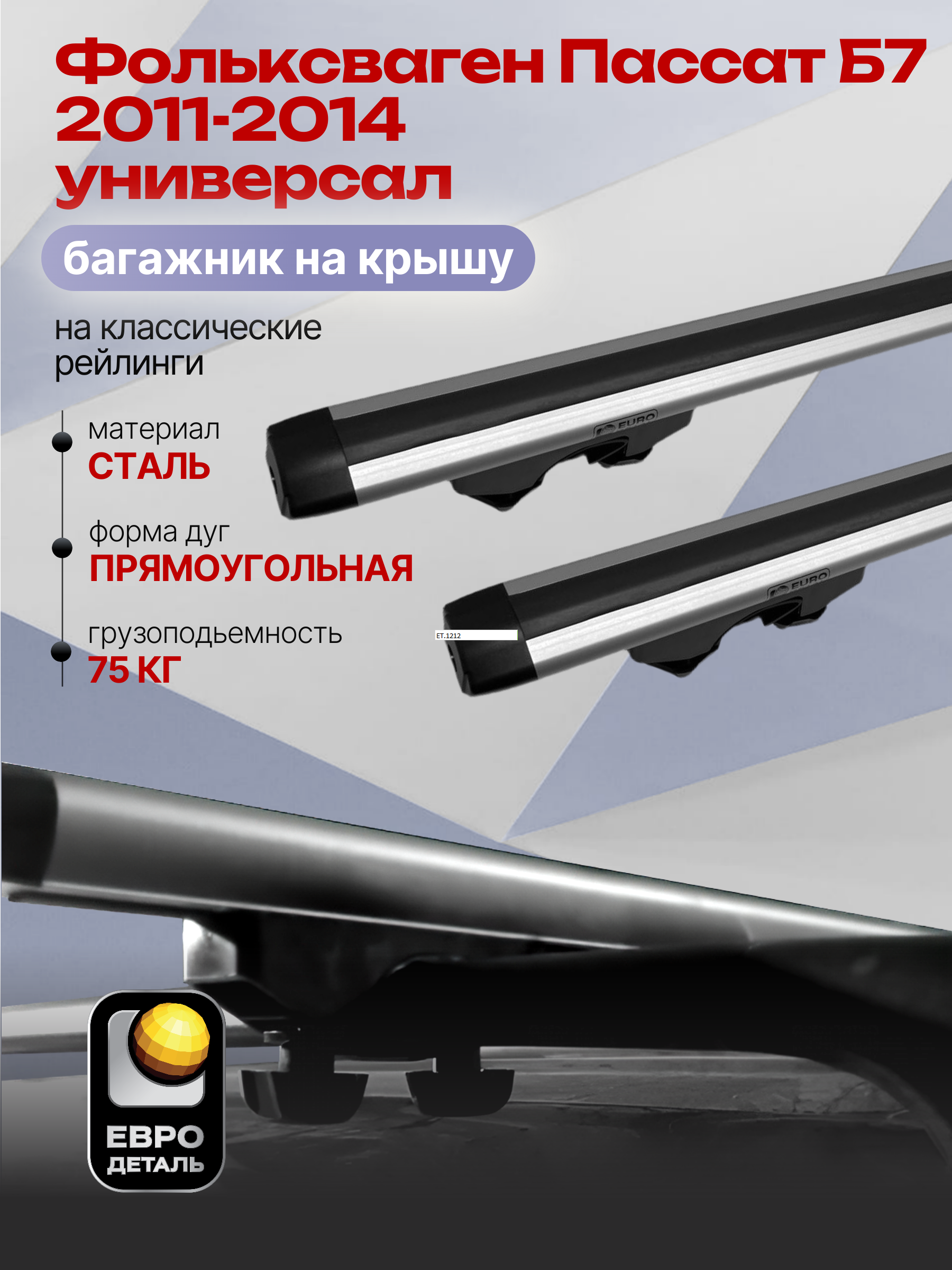 Багажник на крышу ЕвроДеталь Start предназначен для установки на Фольксваген Пассат Б7 2011-2014 универсал с классическими рейлингами.