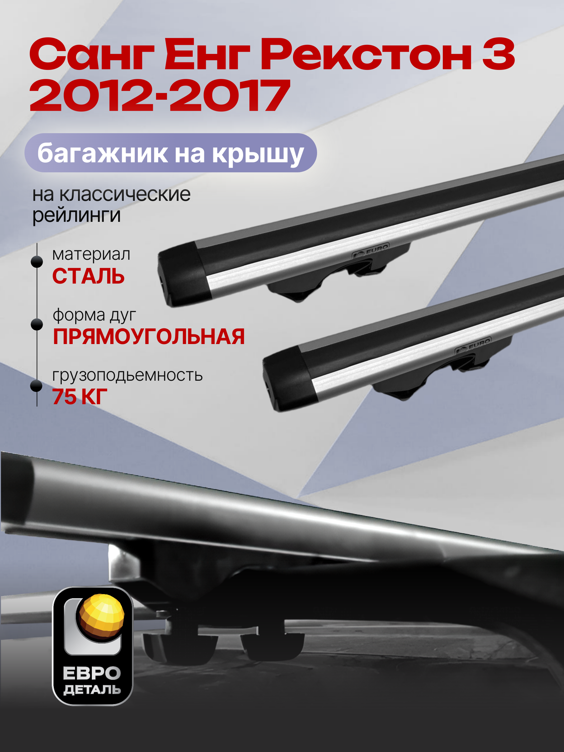 Багажник на крышу ЕвроДеталь Start предназначен для установки на Санг Енг Рекстон 3 2012-2017 с классическими рейлингами.