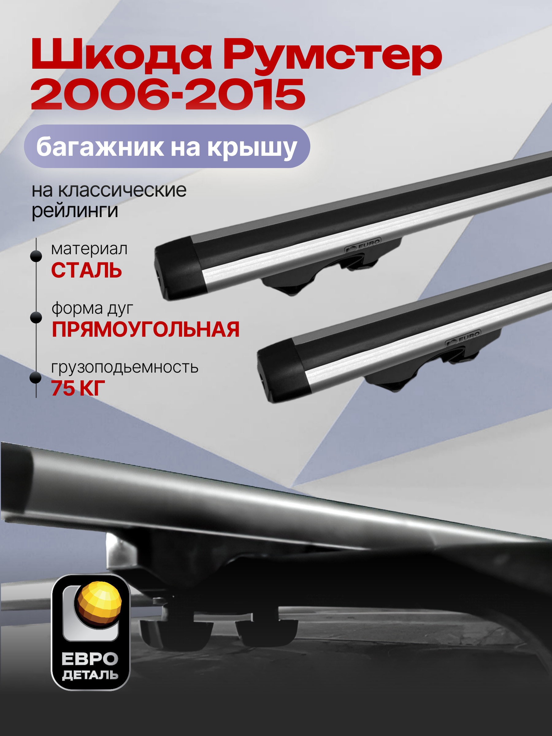 Багажник на крышу ЕвроДеталь Start предназначен для установки на Шкода Румстер 2006-2015 с классическими рейлингами.