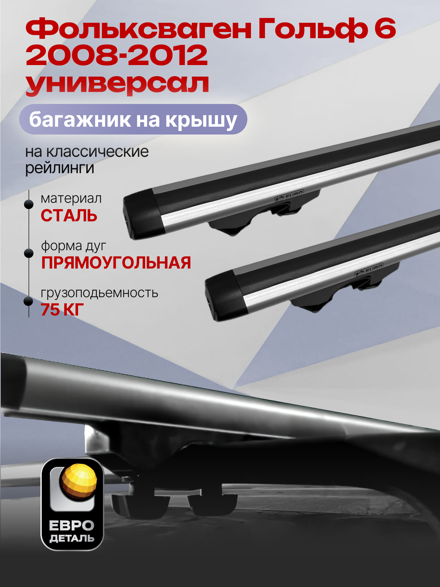 Багажник на крышу ЕвроДеталь Start предназначен для установки на Фольксваген Гольф 6 2008-2012 универсал с классическими рейлингами.