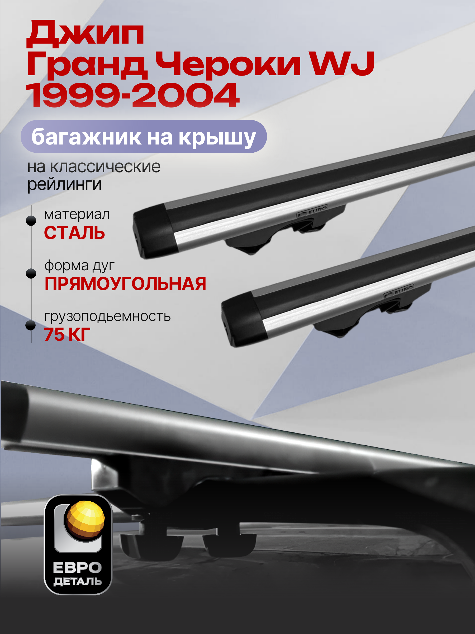 Багажник на крышу ЕвроДеталь Start предназначен для установки на Джип Гранд Чероки WJ 1999-2004 с классическими рейлингами.