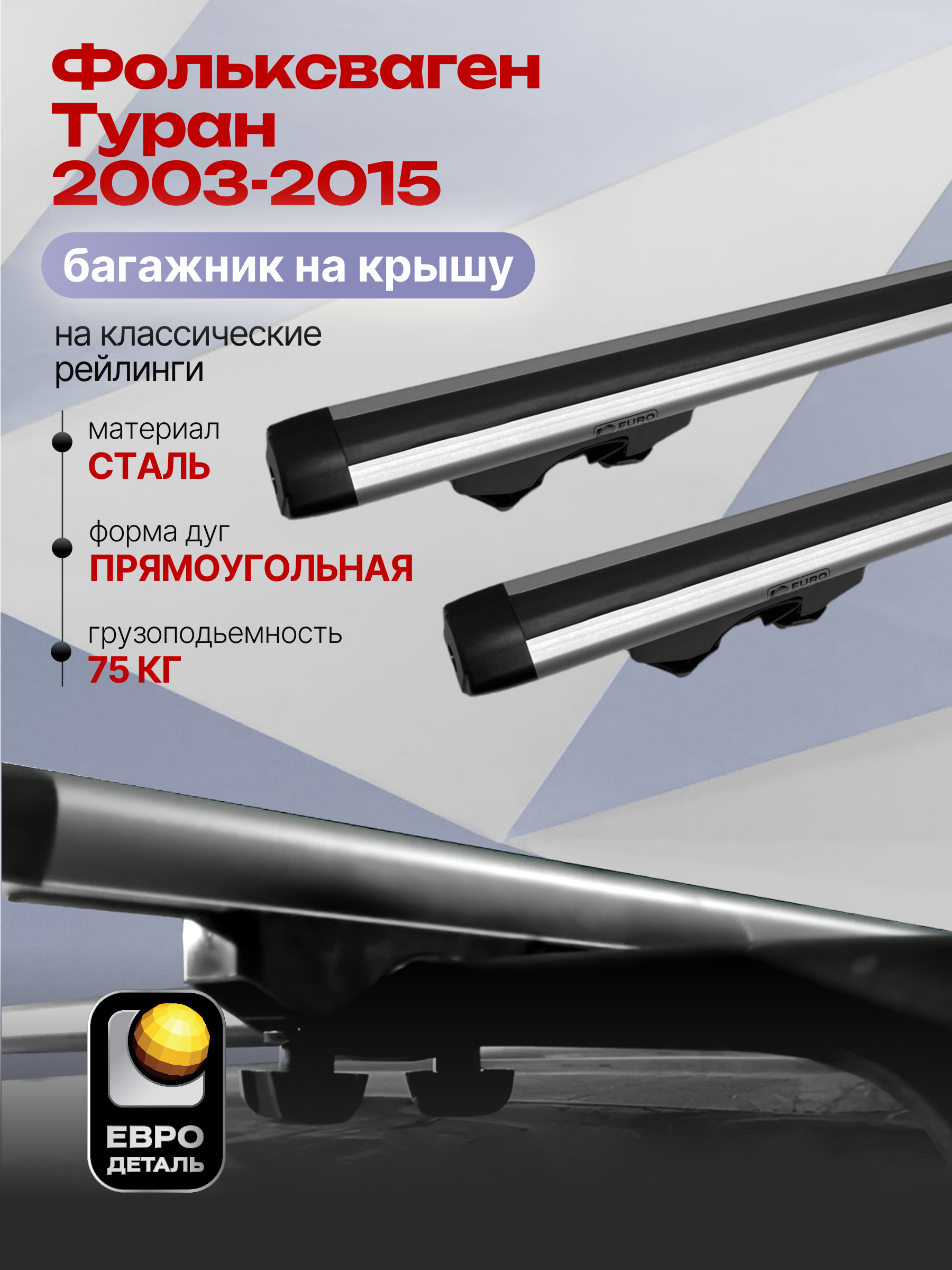 Багажник на крышу ЕвроДеталь Start предназначен для установки на Фольксваген Туран 2003-2015 с классическими рейлингами.
