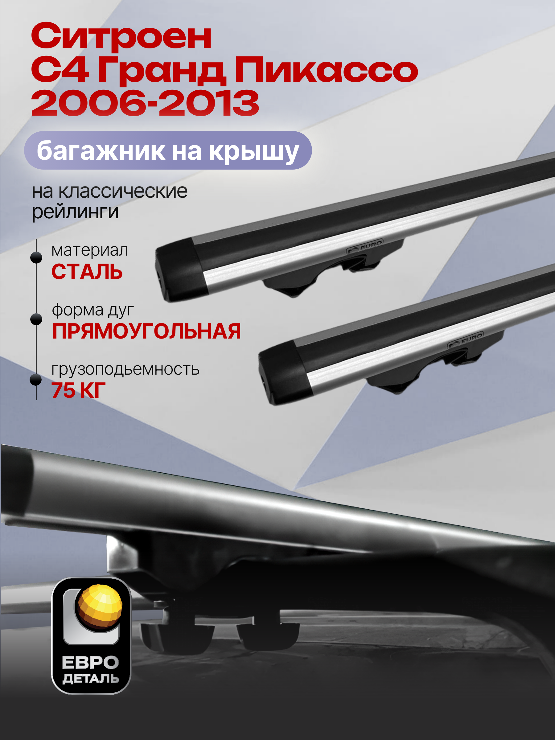 Багажник на крышу ЕвроДеталь Start предназначен для установки на Ситроен С4 Гранд Пикассо 2006-2013 с классическими рейлингами.