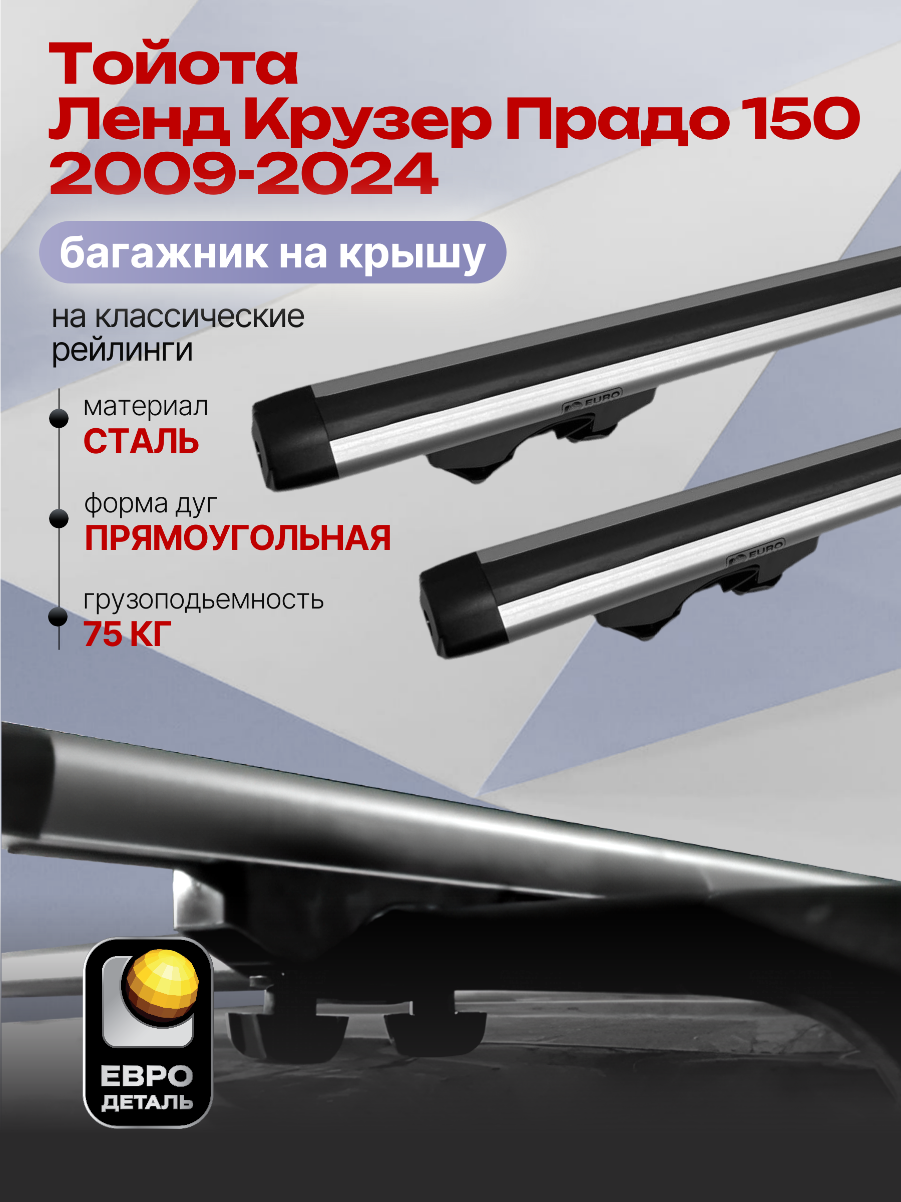 Багажник на крышу ЕвроДеталь Start предназначен для установки на Тойота Ленд Крузер Прадо 150 2009-2024 с классическими рейлингами.