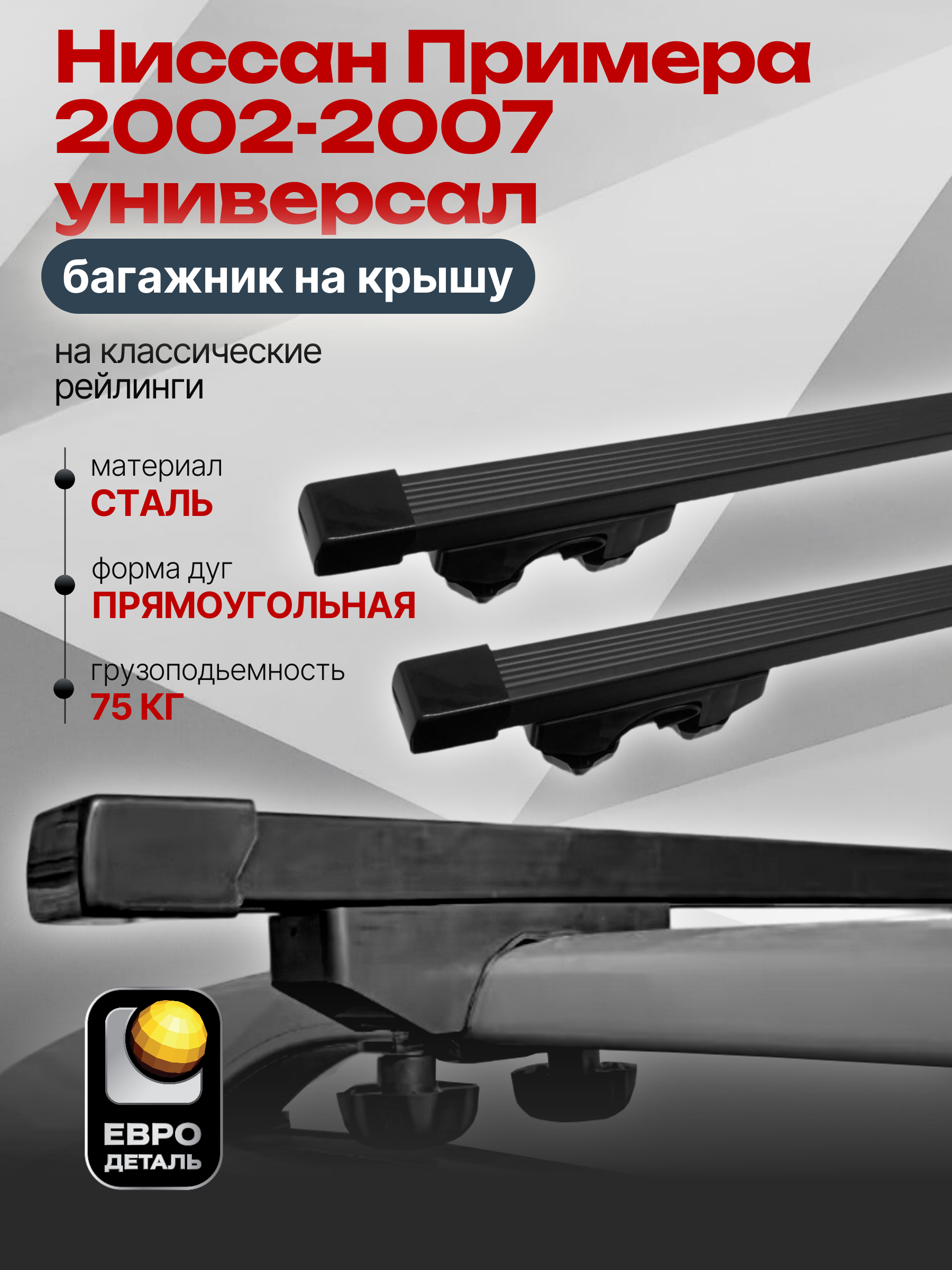 Багажник на крышу ЕвроДеталь Start предназначен для установки на Ниссан Примера 2002-2007 универсал, черный с классическими рейлингами.